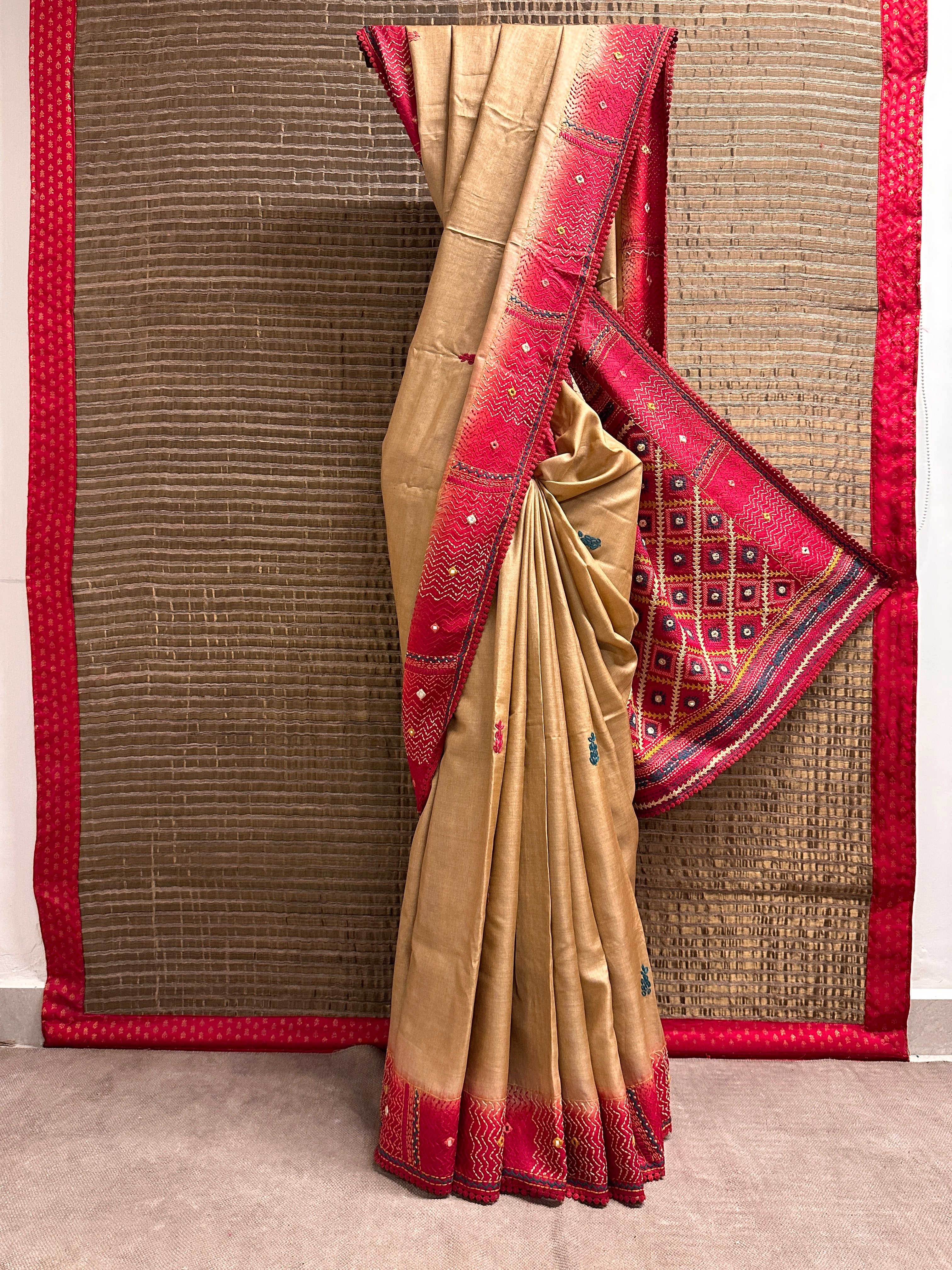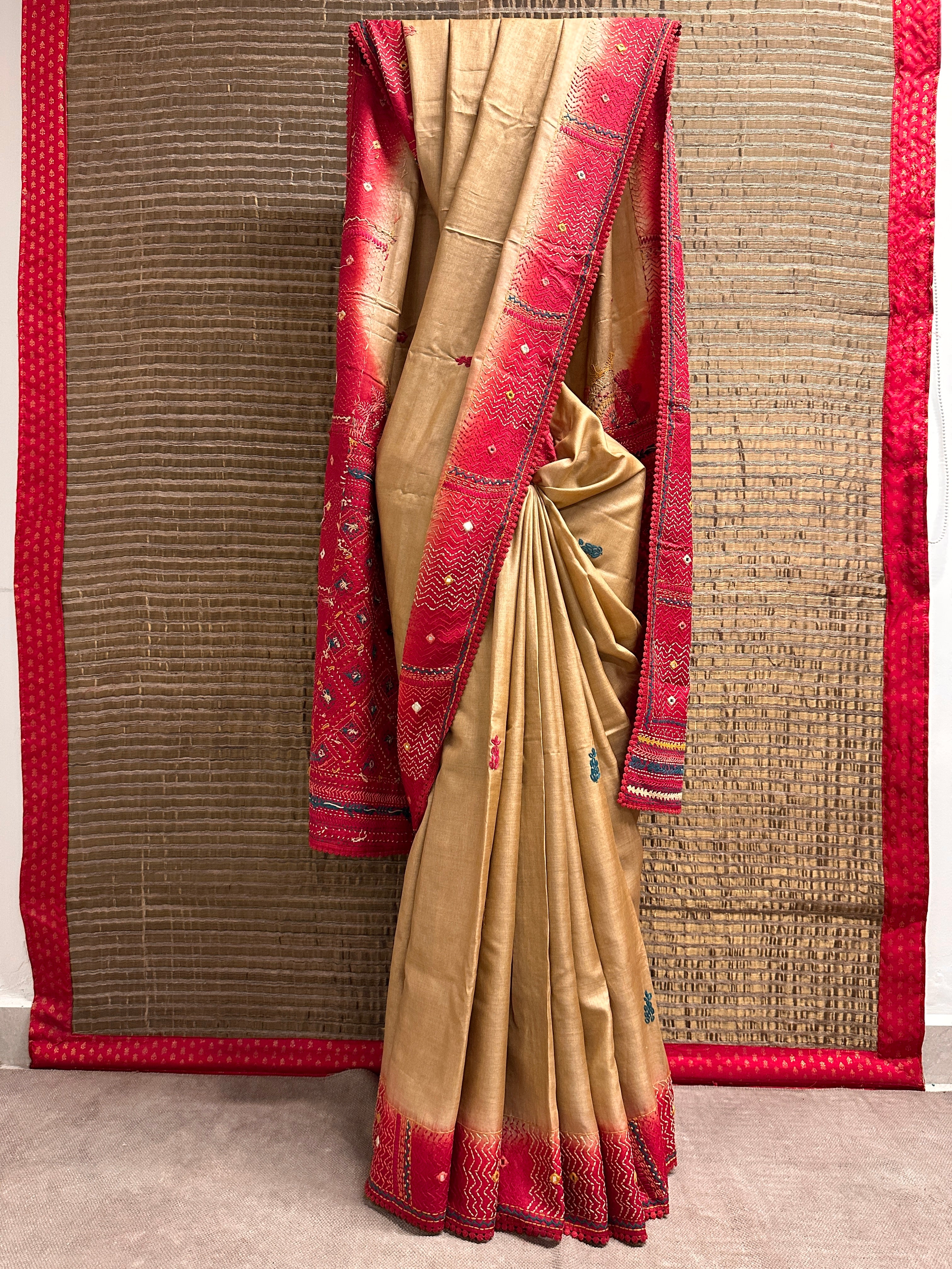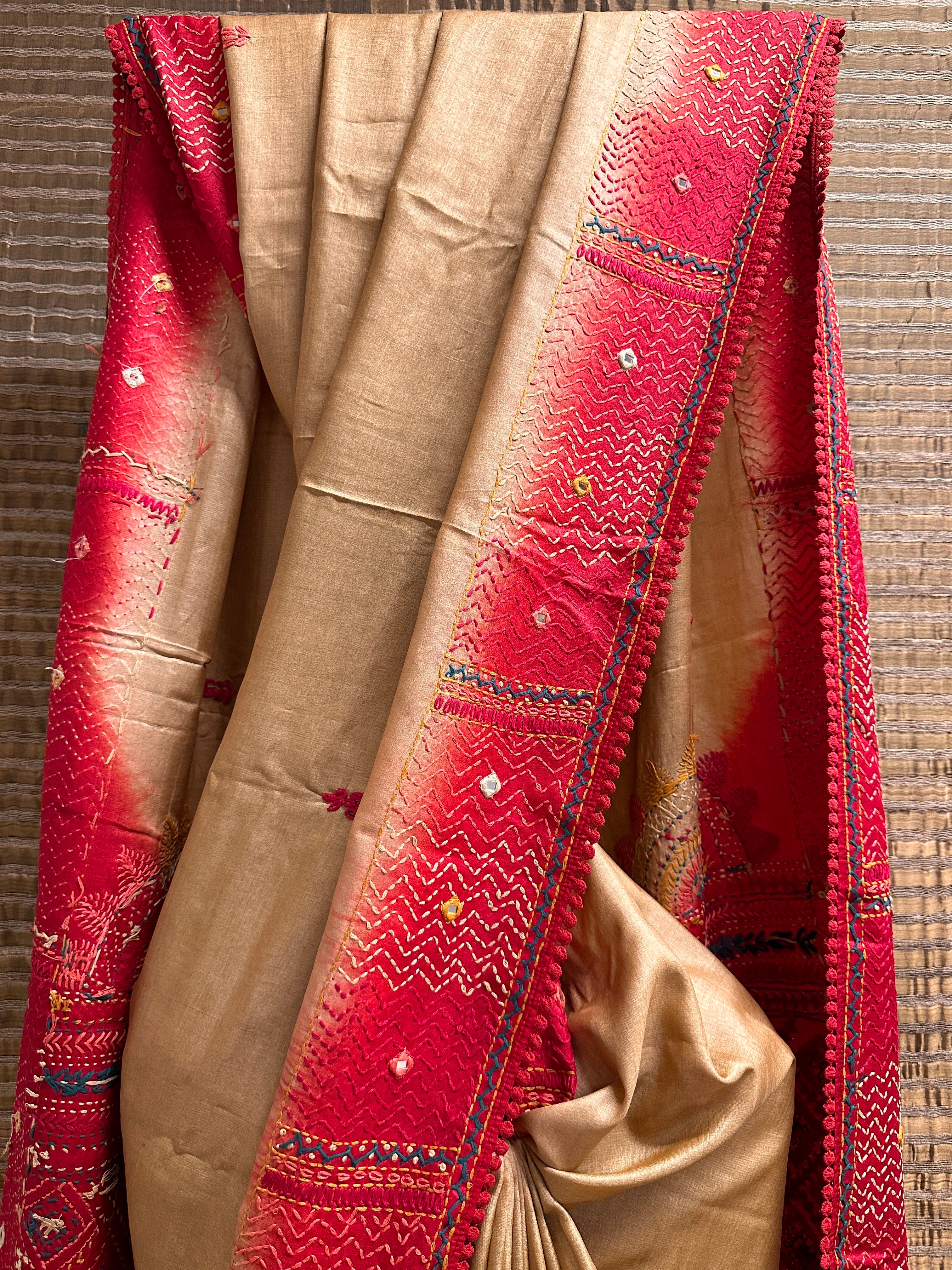 • Bold red border with kantha work for striking contrast and festive appeal.