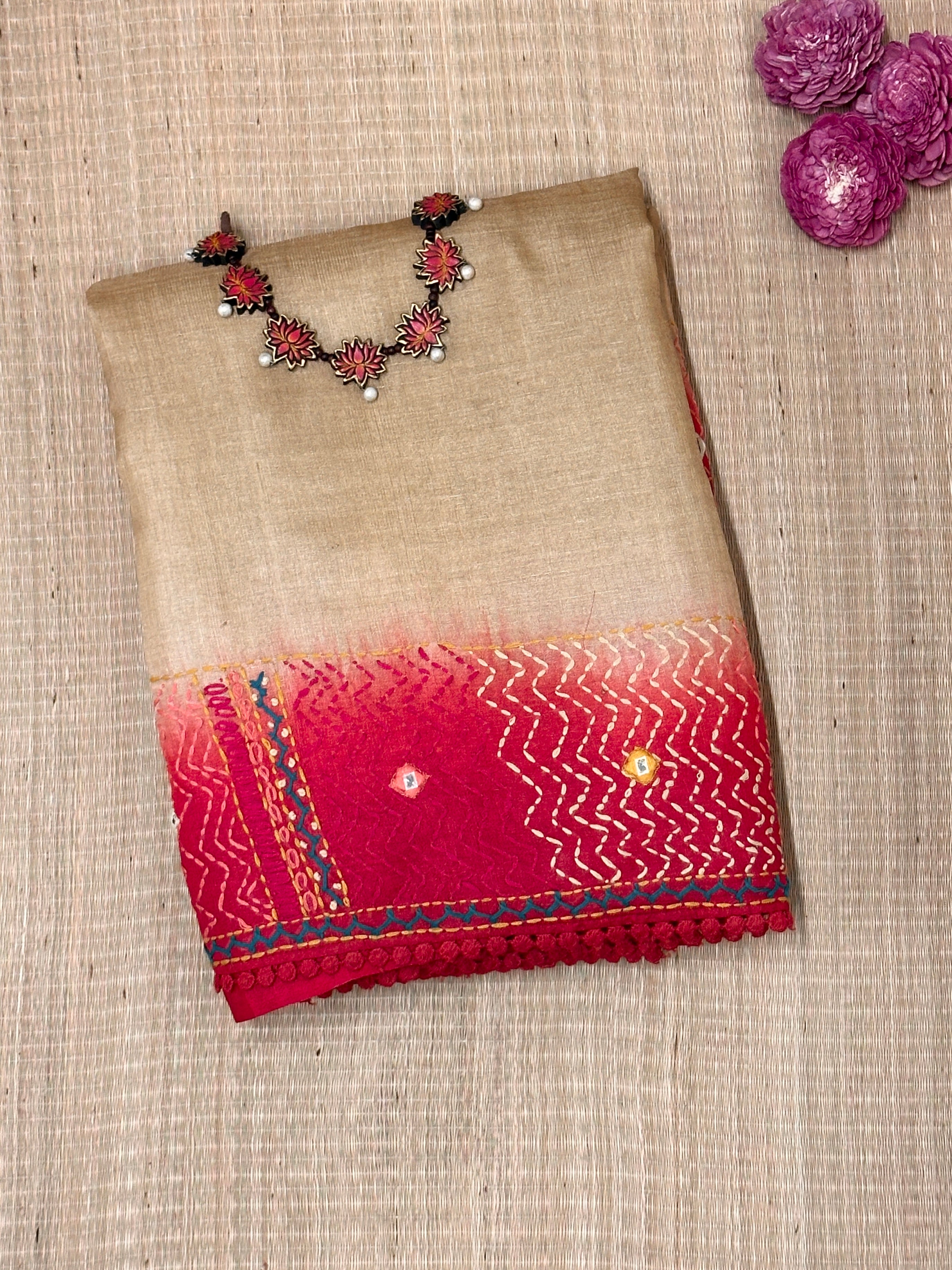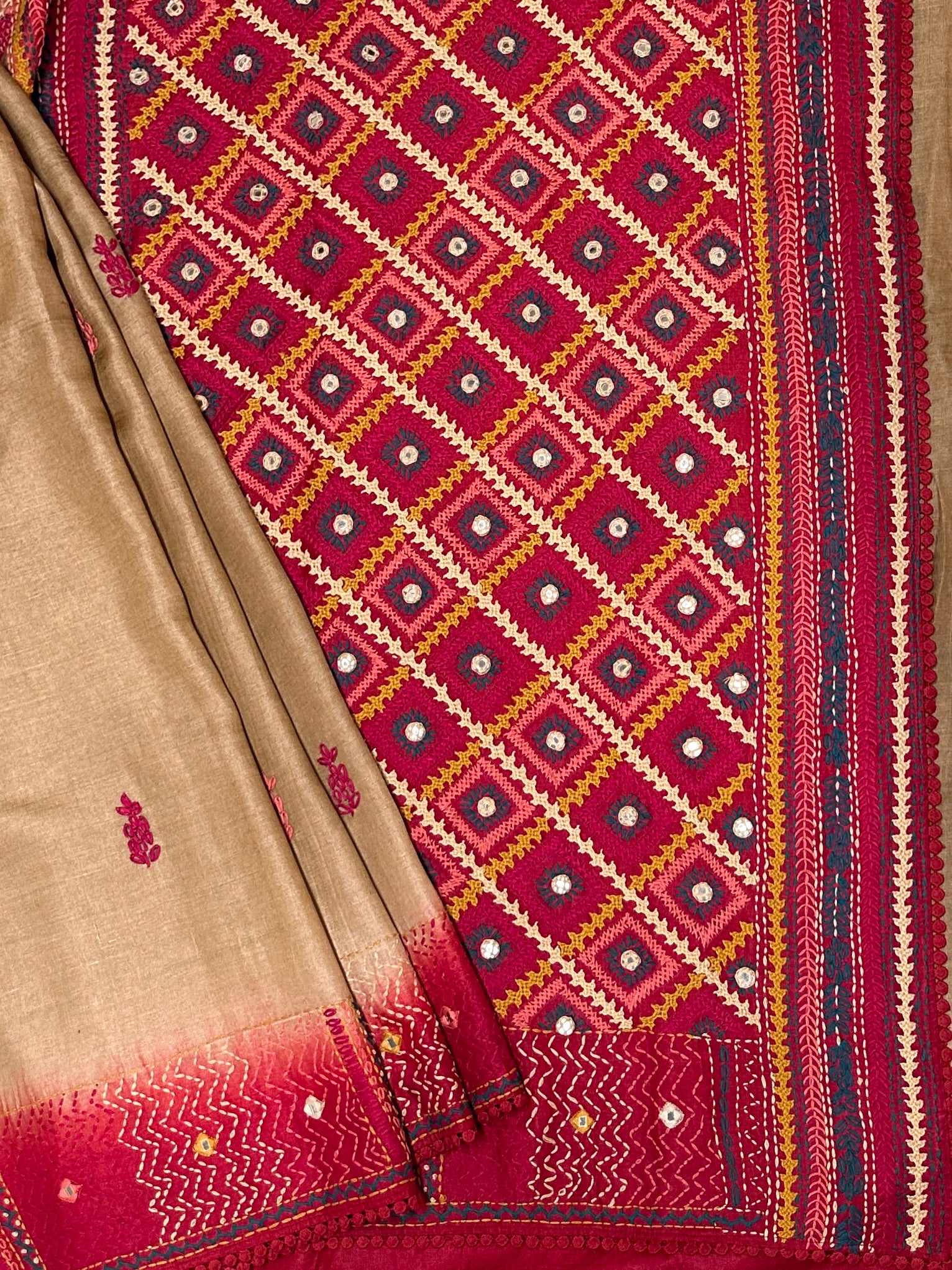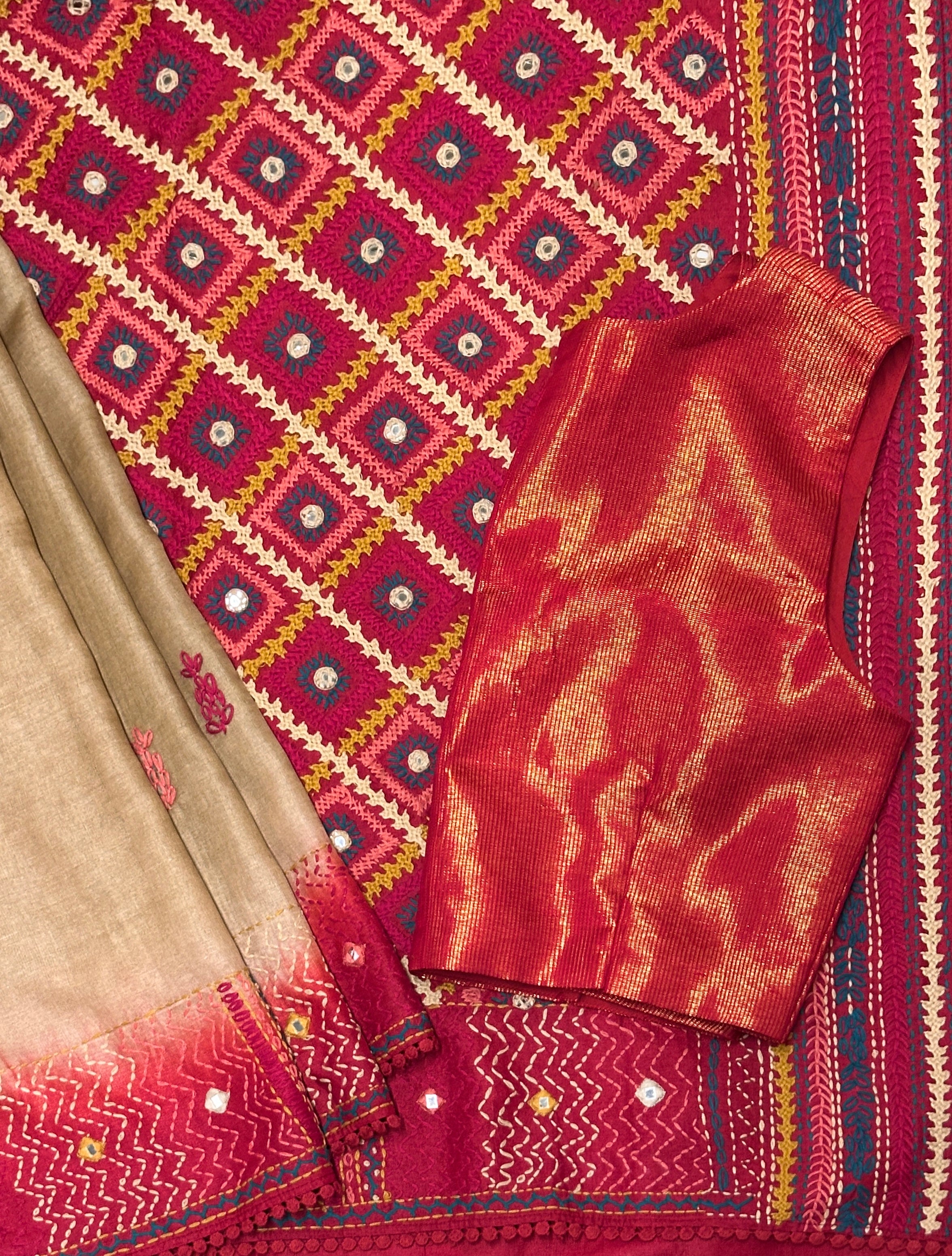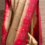• Bold red border with kantha work for striking contrast and festive appeal.