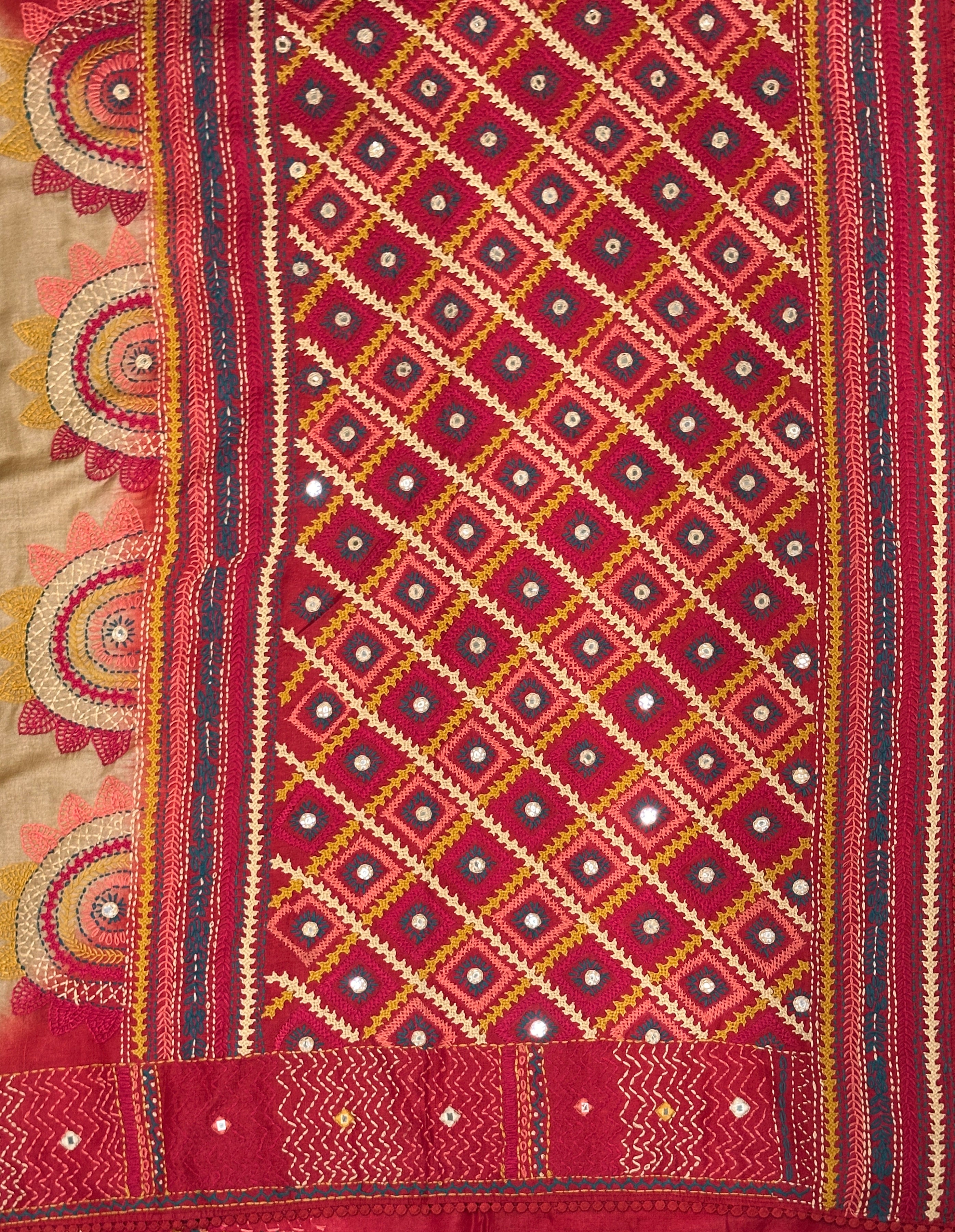• Pallu richly embellished with Kutch style mirror work adding shimmer and ethnic grandeur.