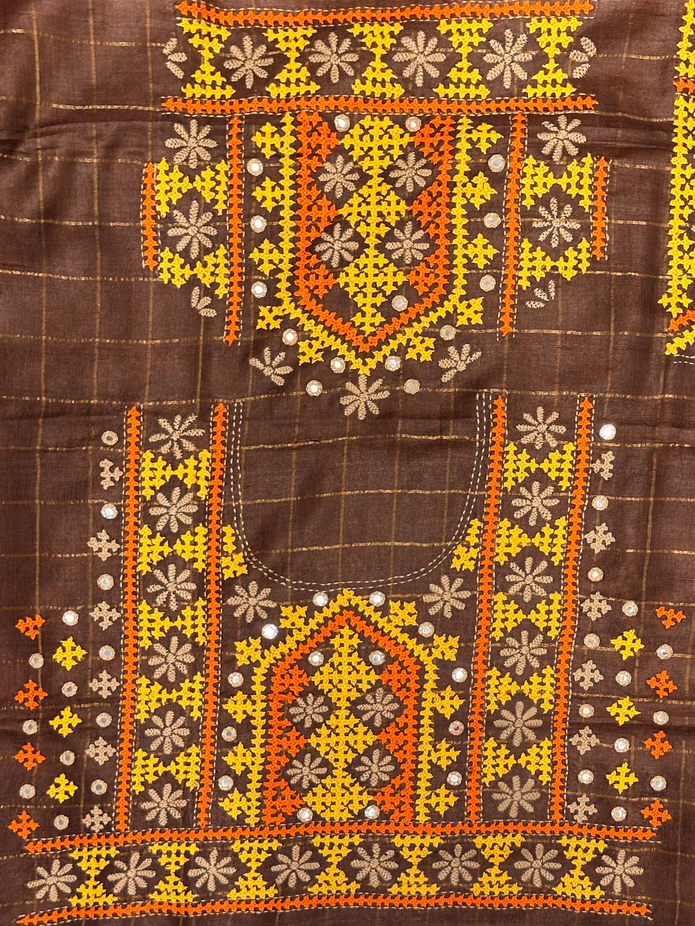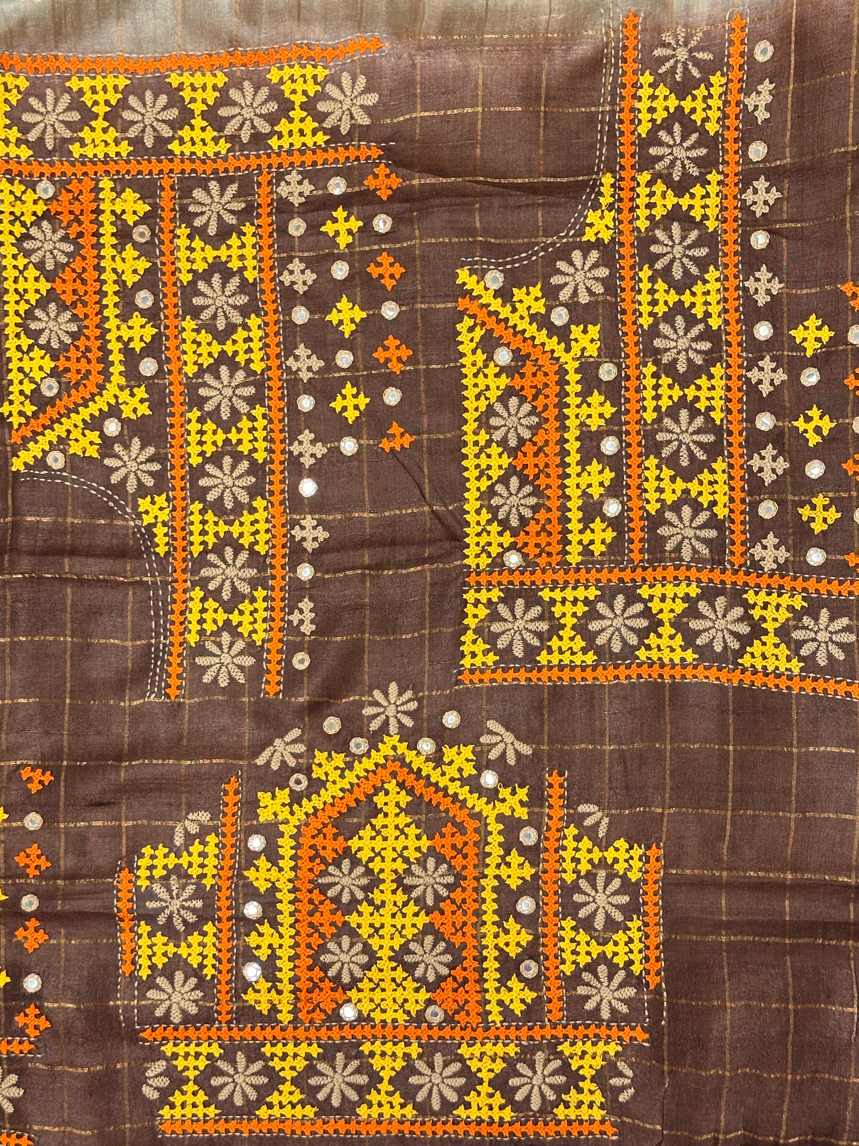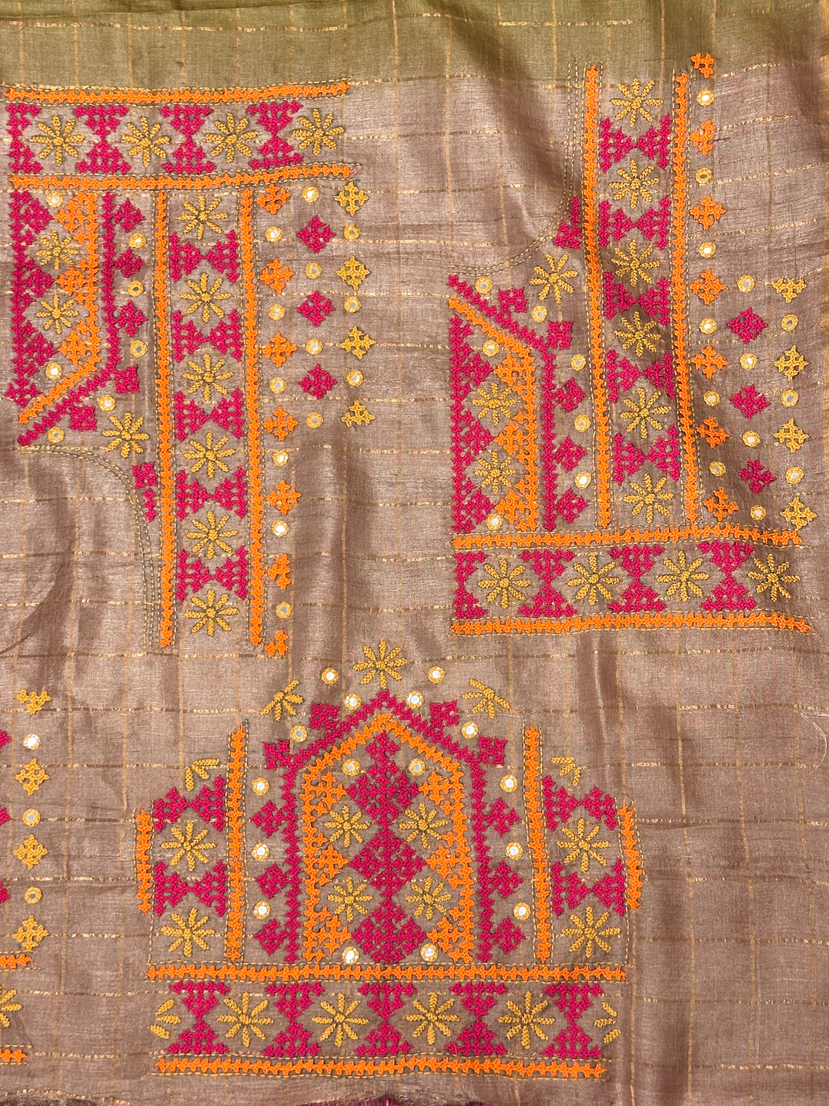 • The blouse features intricate Kutch work and detailed thread embroidery, adding artisanal elegance.