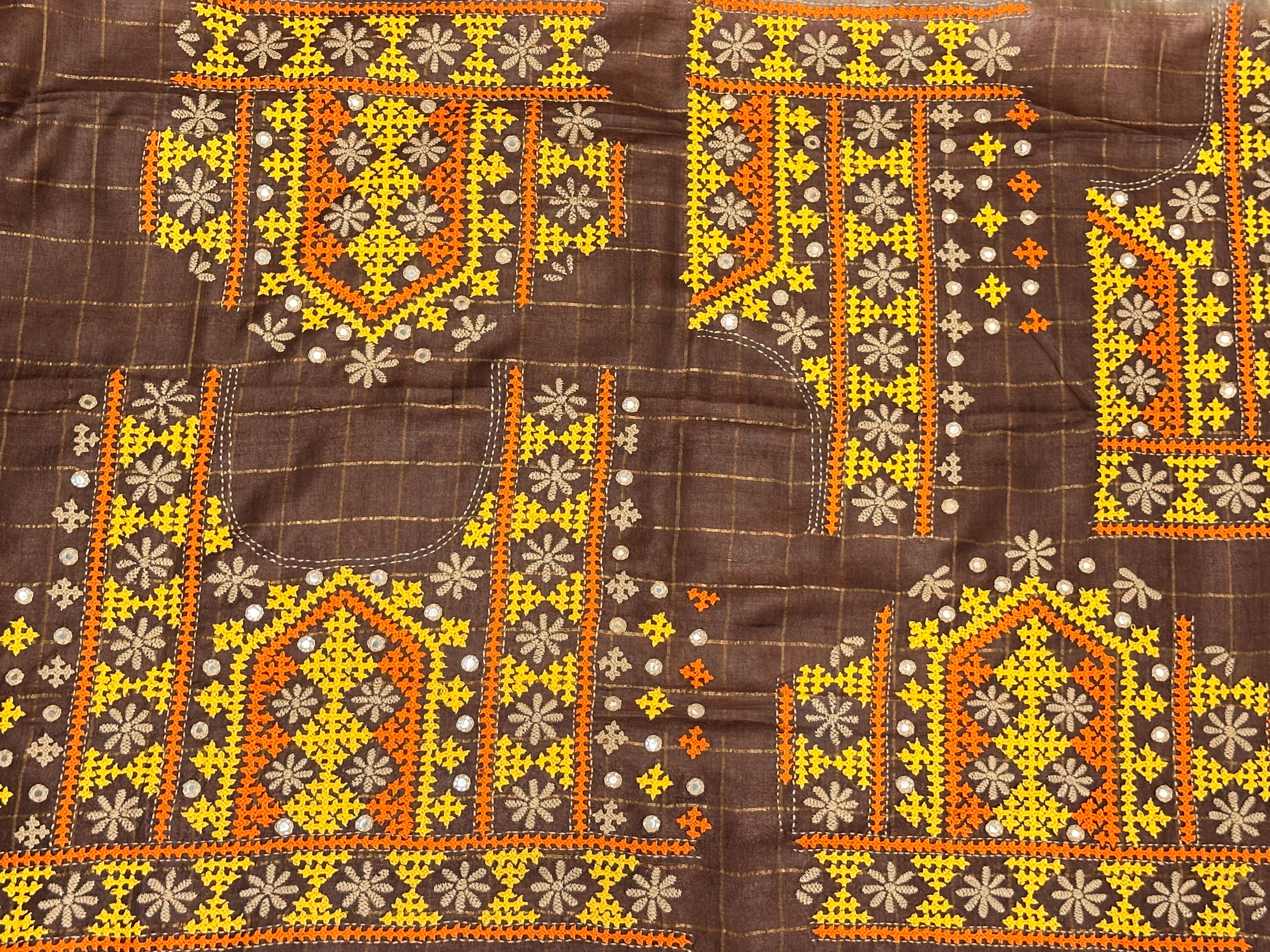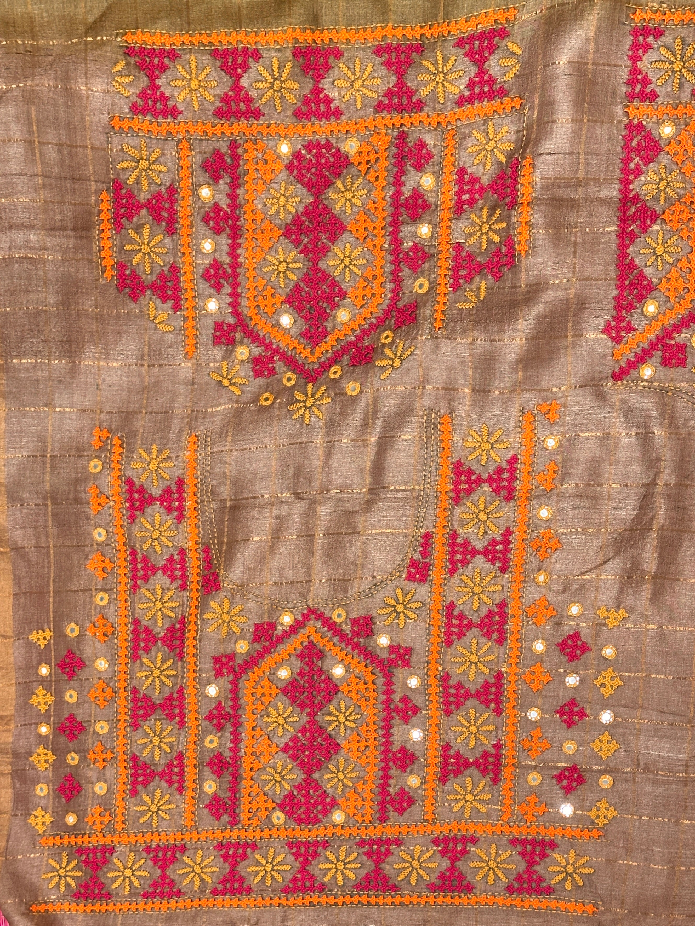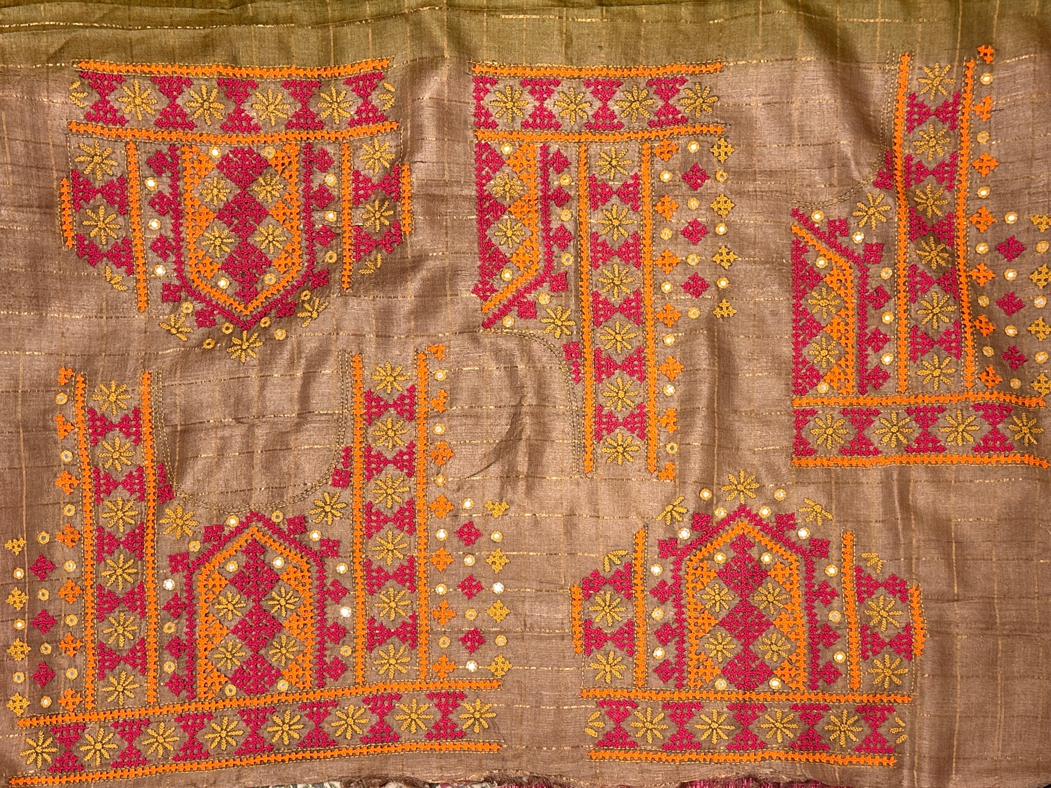 • The blouse features intricate Kutch work and detailed thread embroidery, adding artisanal elegance.