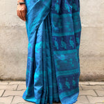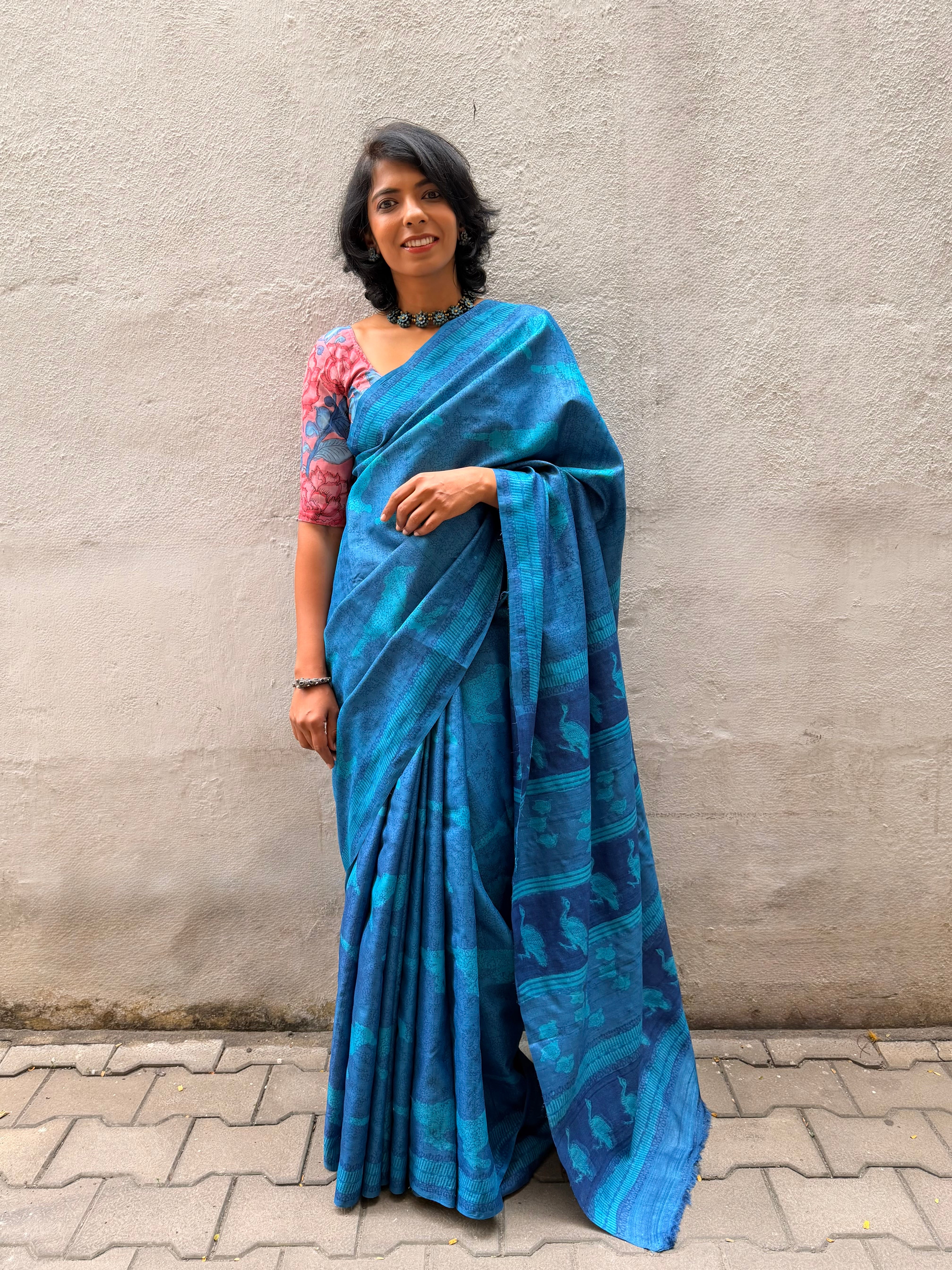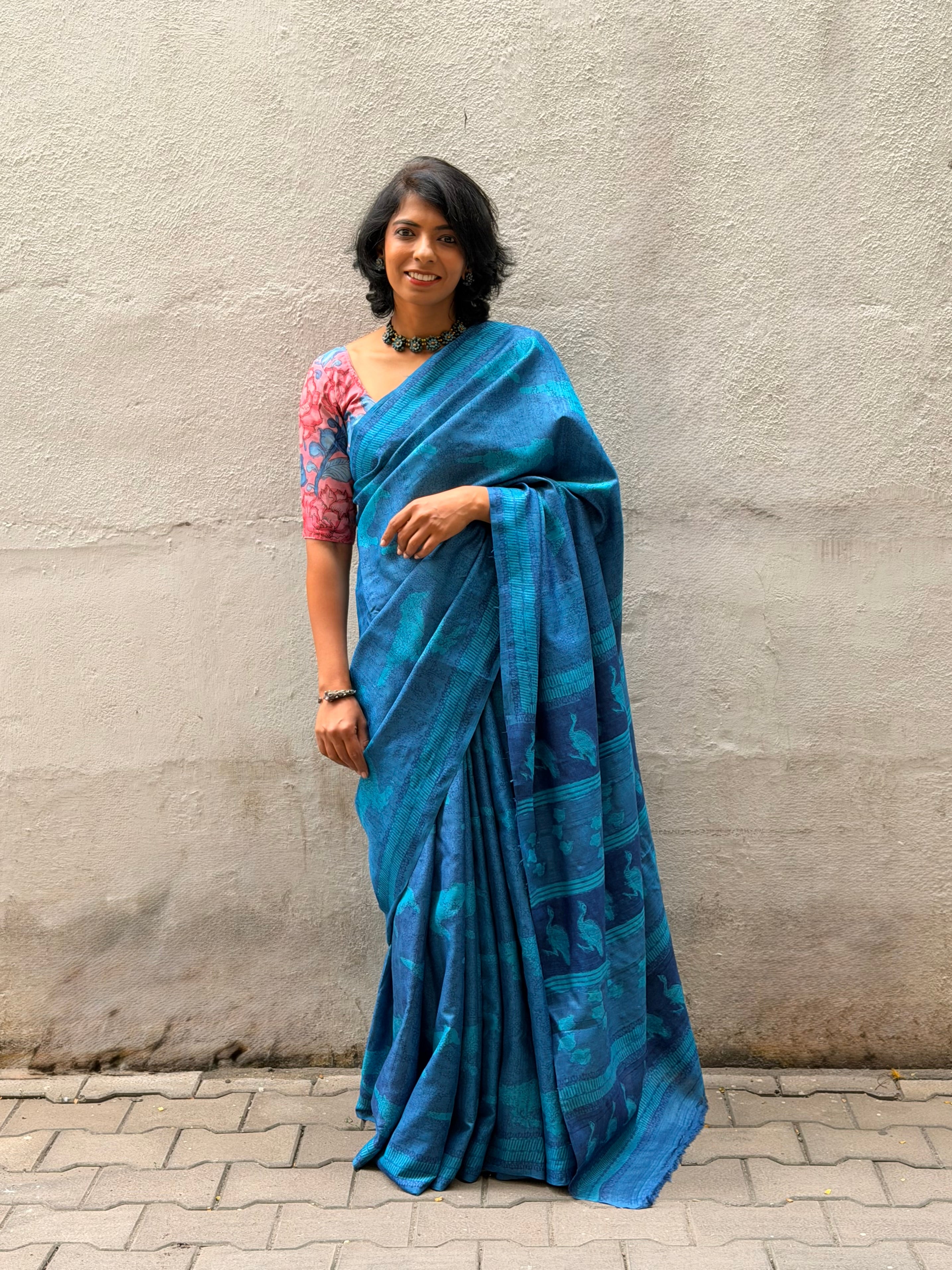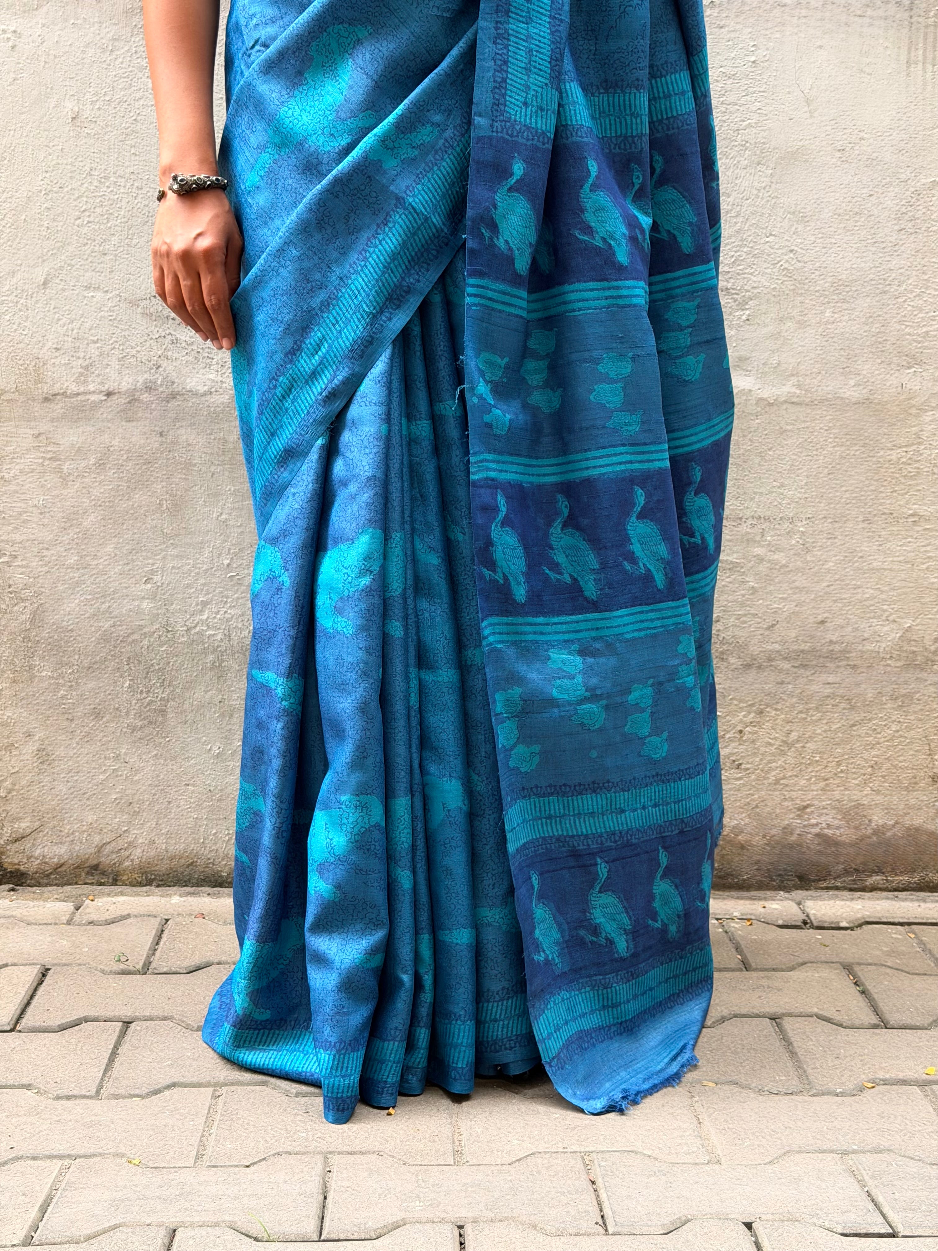 Tussar silk saree featuring delicate bird prints for a soft, artistic appeal