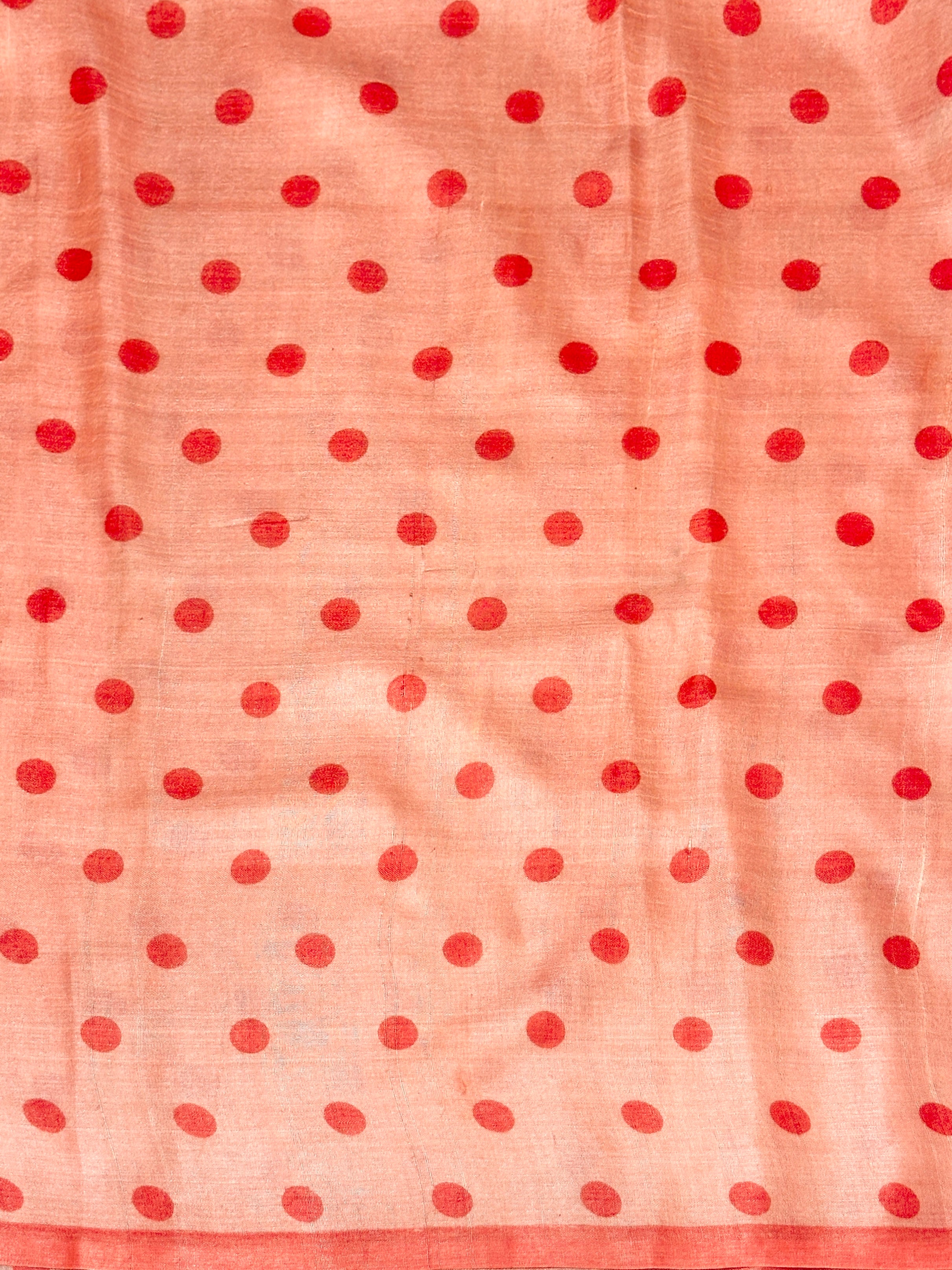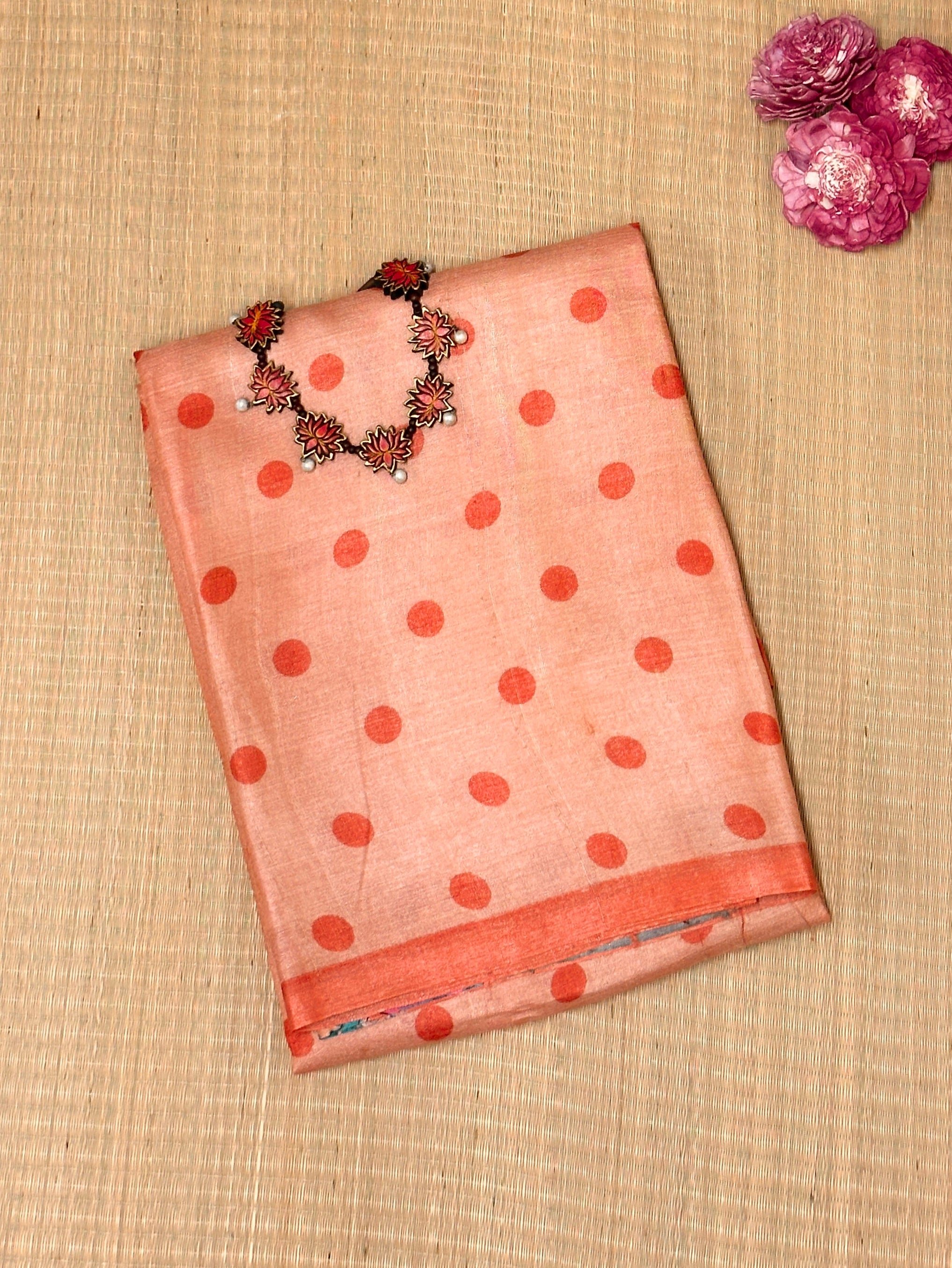 • Pure tussar silk saree in a classic pink polka.