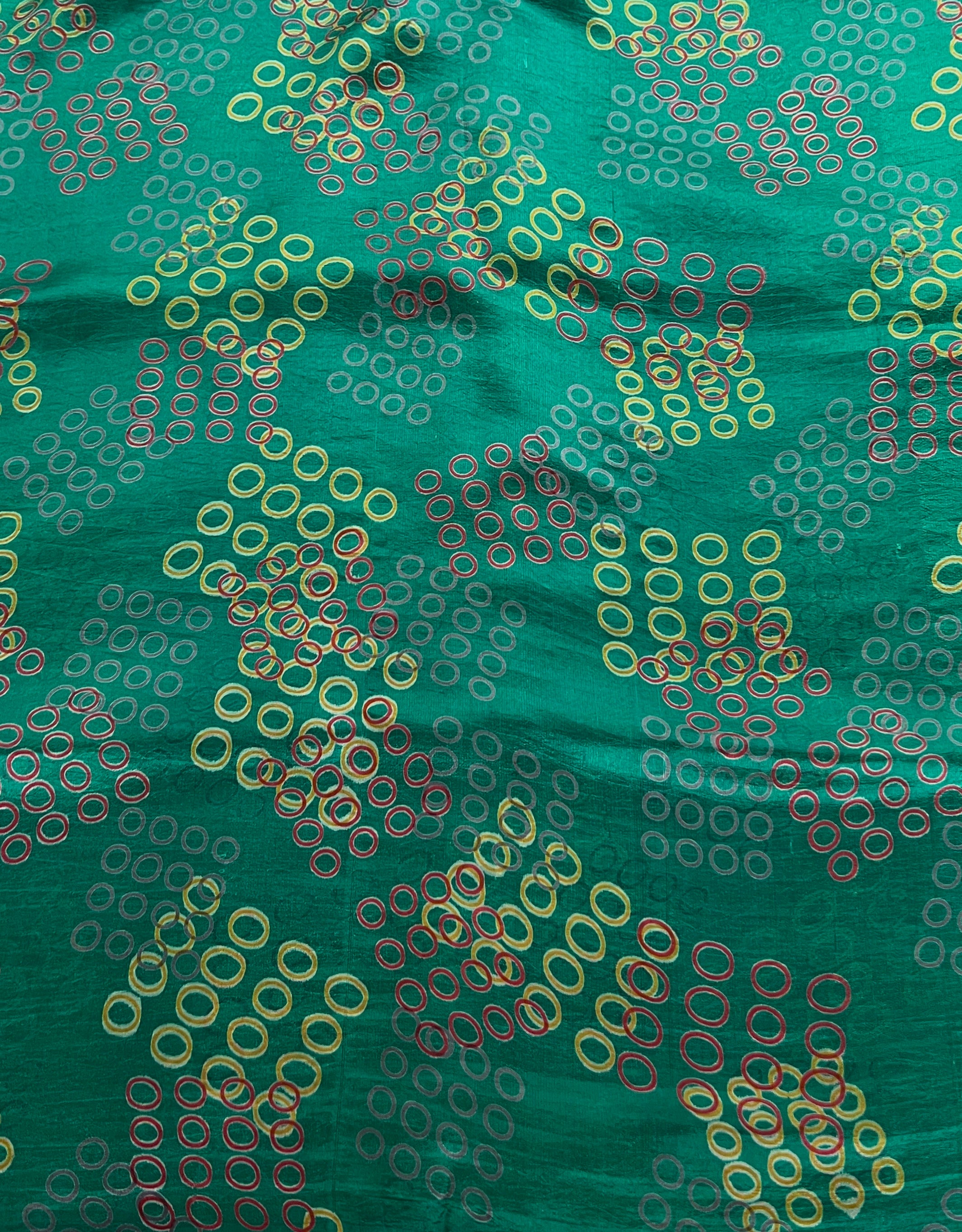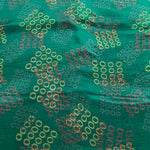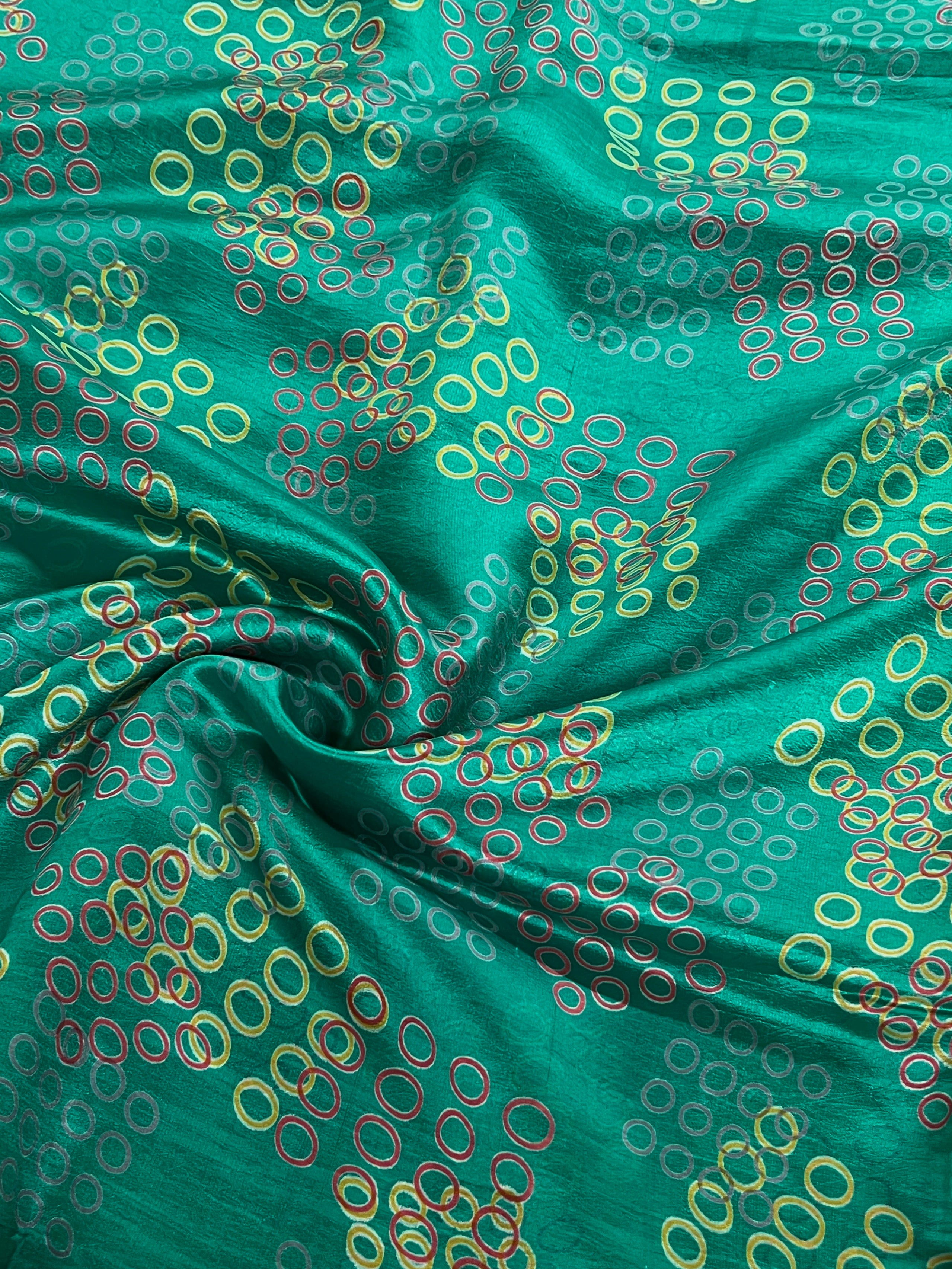 Premium silk fabric featuring hand block printed colourful ring motifs across the body