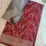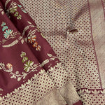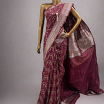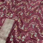 Dark brown handwoven pure silk saree with multicolour floral design along with gold zari all over the body in Benaras weave. The border of the saree is woven in dark brown with geometric patterns in gold zari. The pallu of the saree geometric patterns in gold zari on dark brown. Blouse : Dark brown silk with gold zari border It can be paired with any silver jewelry and ready to wear blouse to add more shine and colour and the same can be purchased from the Accessories and Ready to wear section respectively. Note : The tailored blouse featured is only for reference.