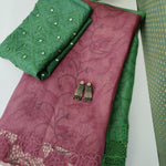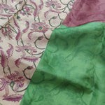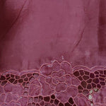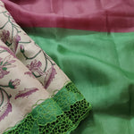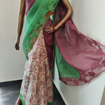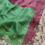 Plum and green organza saree. Saree features plain body and handblock printed floral pattern on beige over pleats portion. The saree also has cutwork border, which adds a touch of elegance and sophistication to its design. Cutwork is a needlework technique in which portions of a textile are cut away and the resulting ?hole? is reinforced? and filled with embroidery or needle lace. Overall, it is a stunning and versatile garment that can be worn for a variety of occasions. Its intricate design and rich color make it a popular choice for weddings, formal events, and other special occasions. Blouse: Plum organza with cutwork Wash Care: Dry clean only It can be paired with any silver jewelry and ready to wear blouse to add more shine and colour and the same can be purchased from the? ? Accessories ? and ? Ready to wear?? section respectively. Note : The tailored blouse featured is only for reference. more