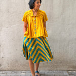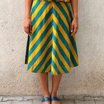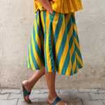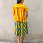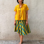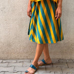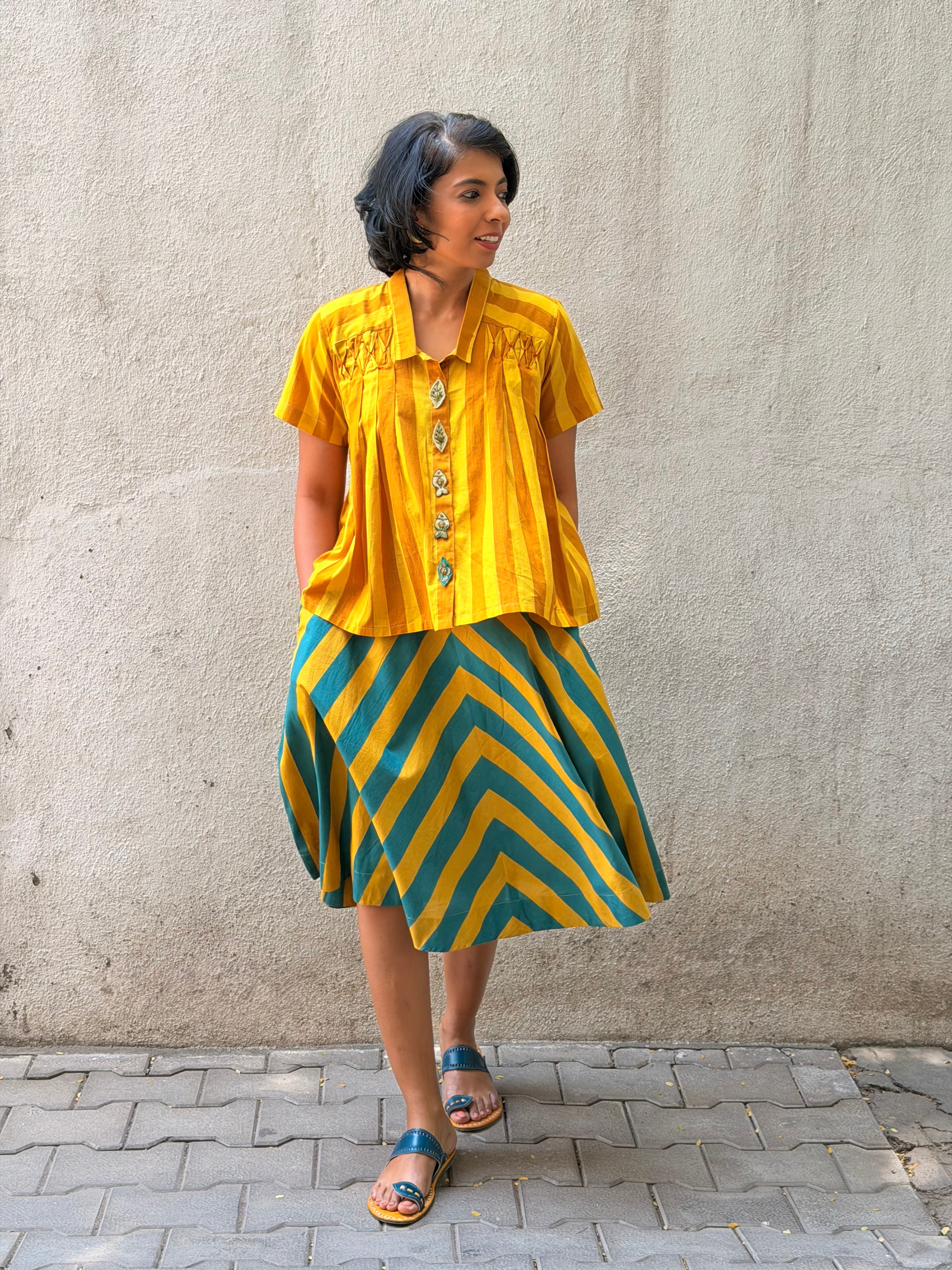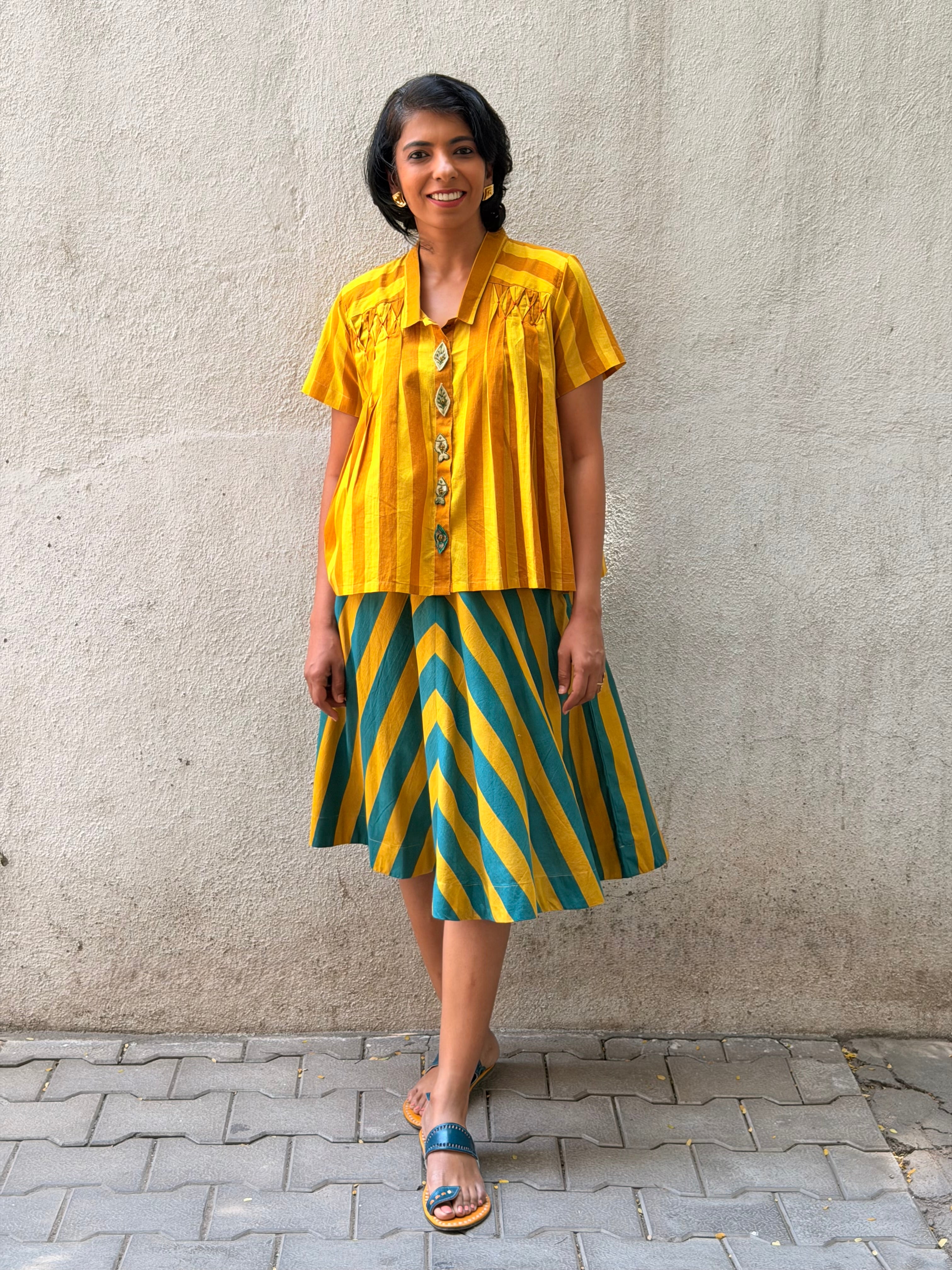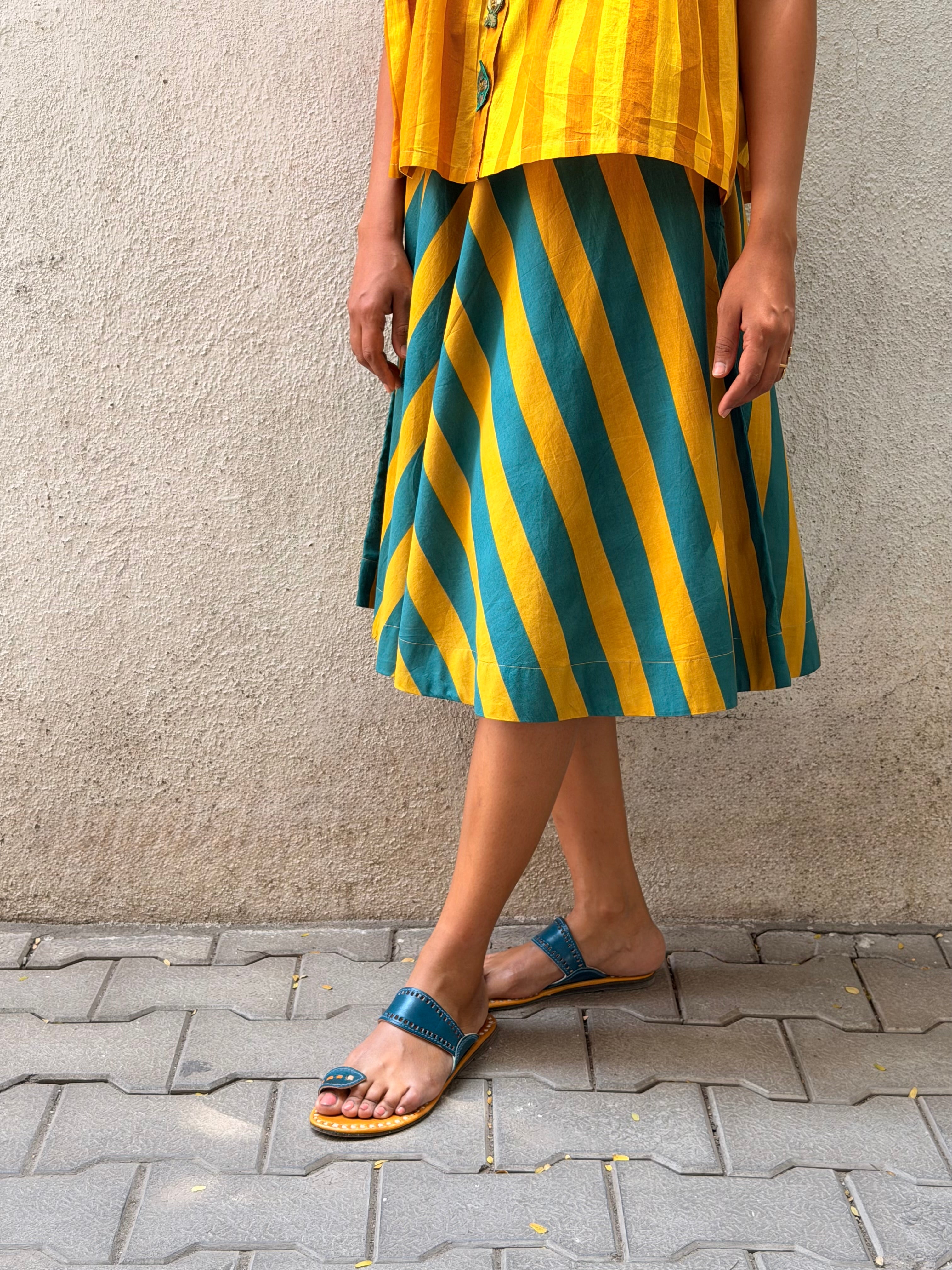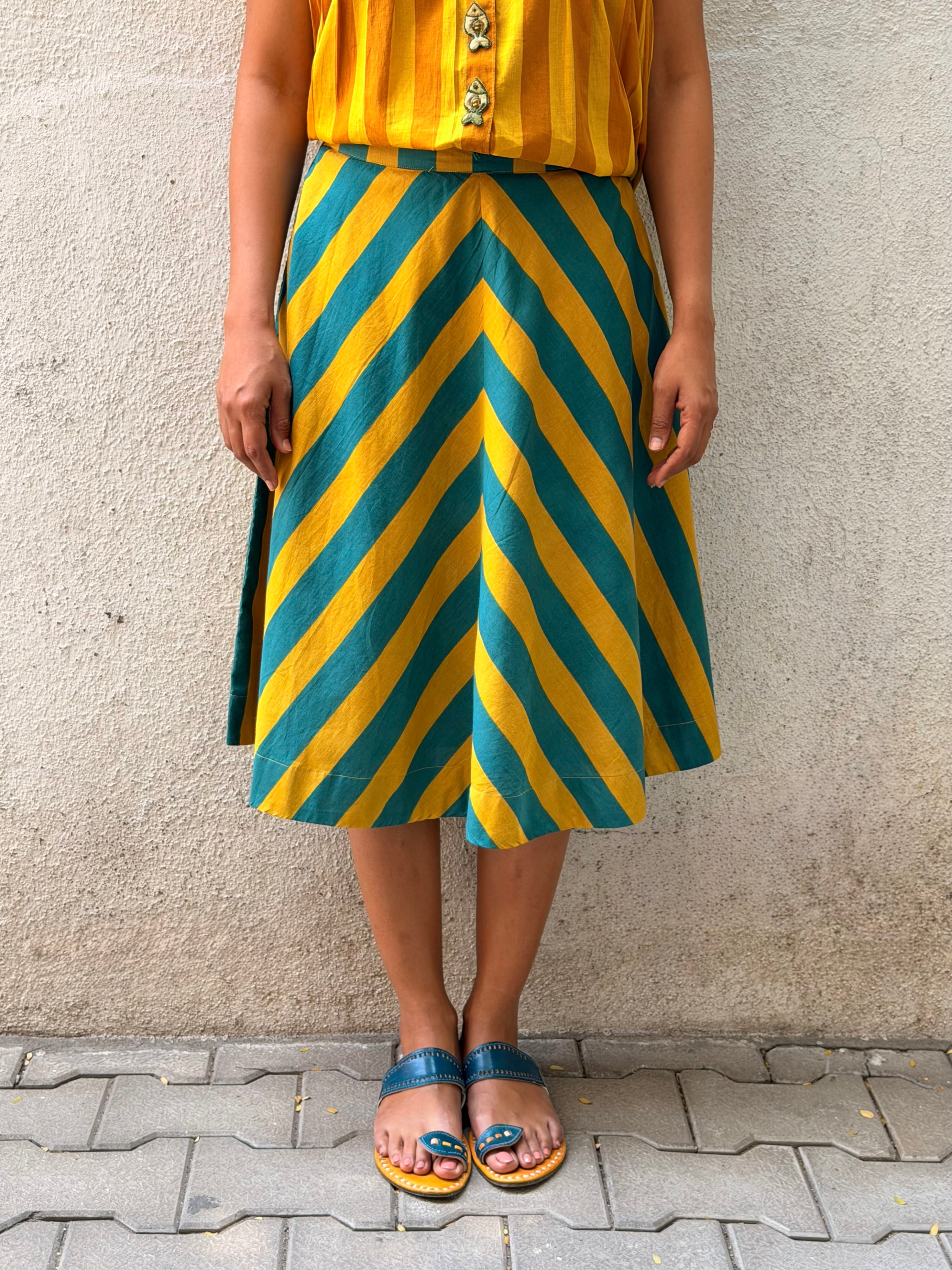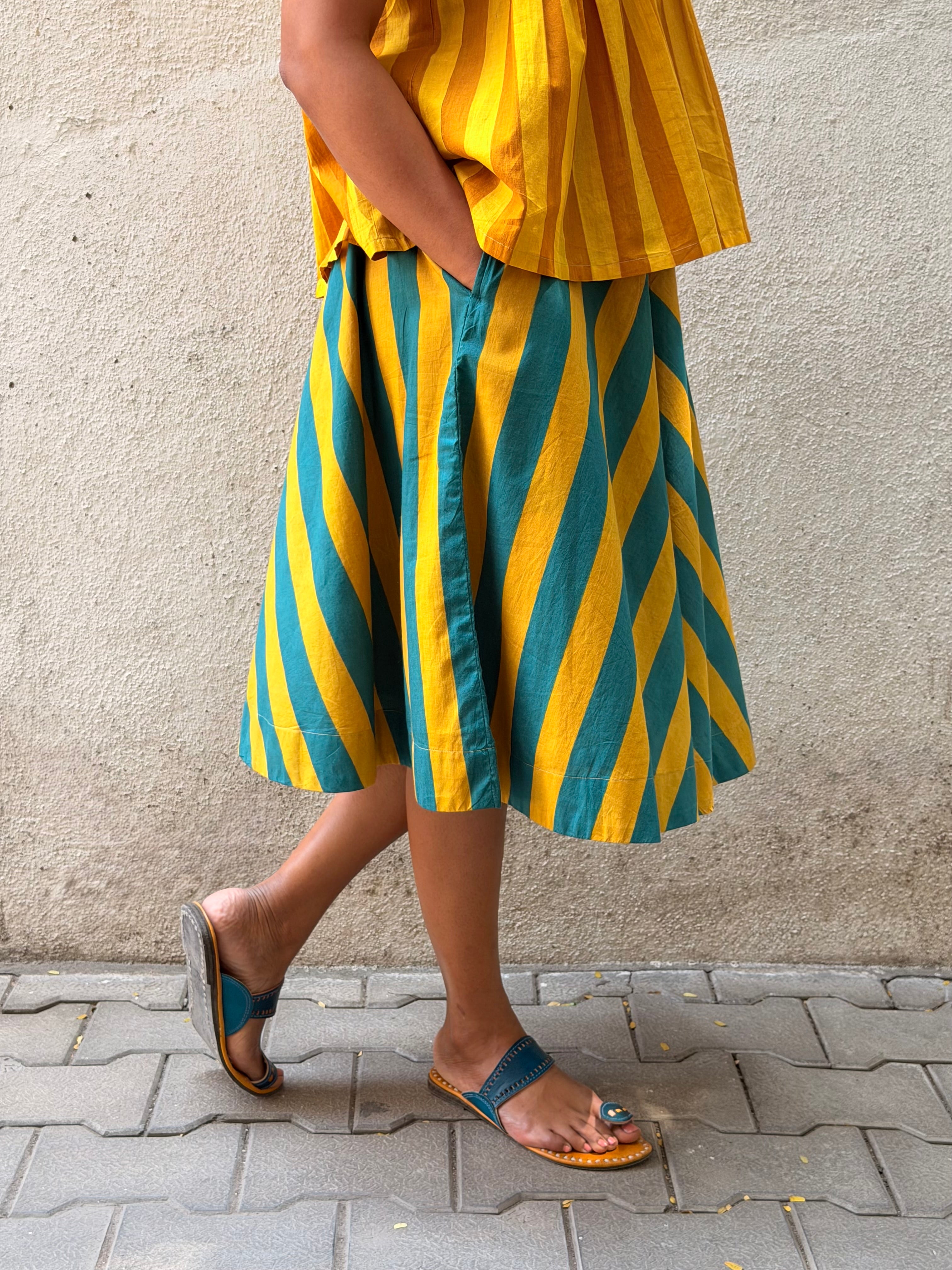 - A-line skirt crafted in printed handloom cotton, paired with a soft mul lining for comfort and structure.