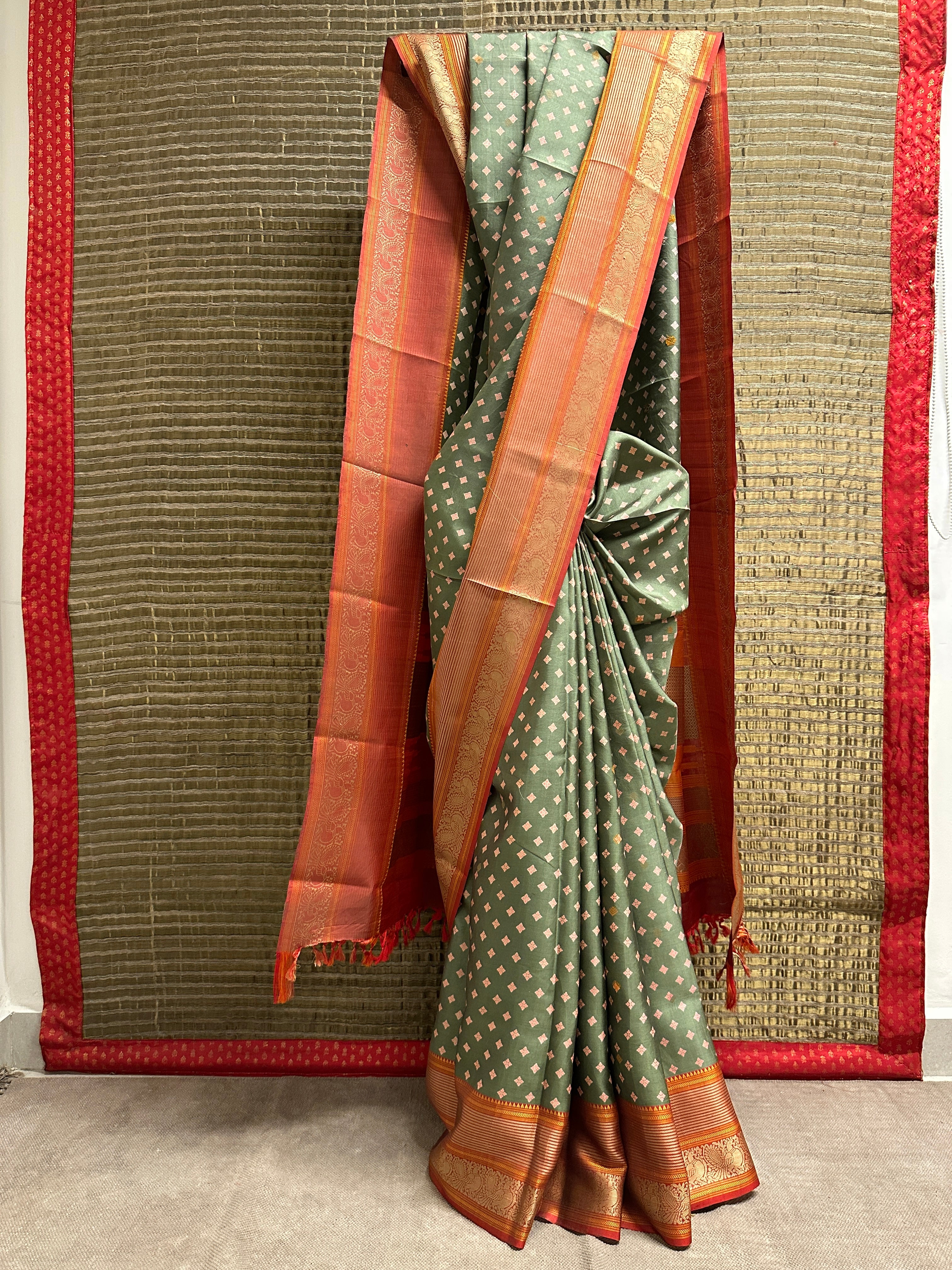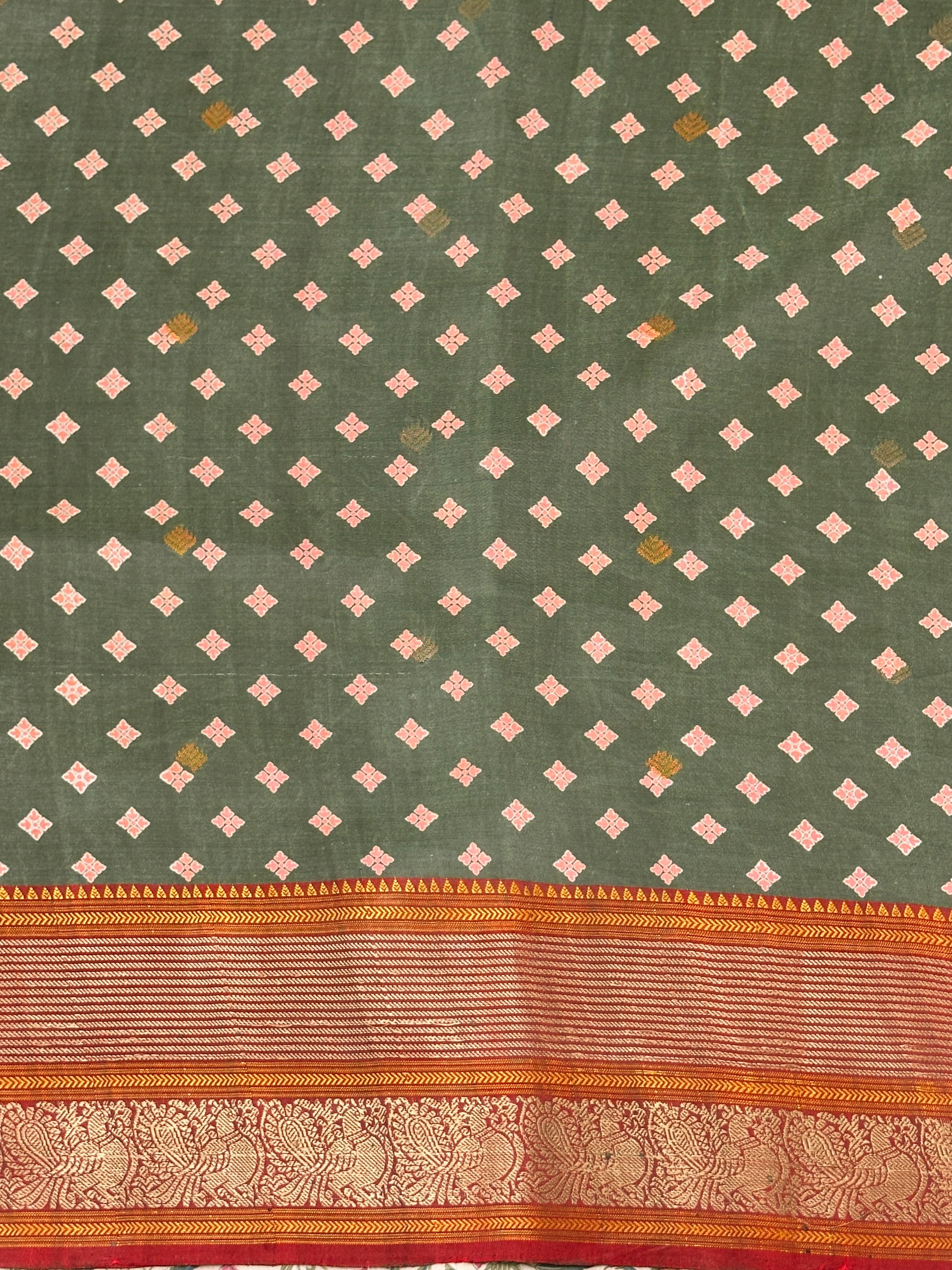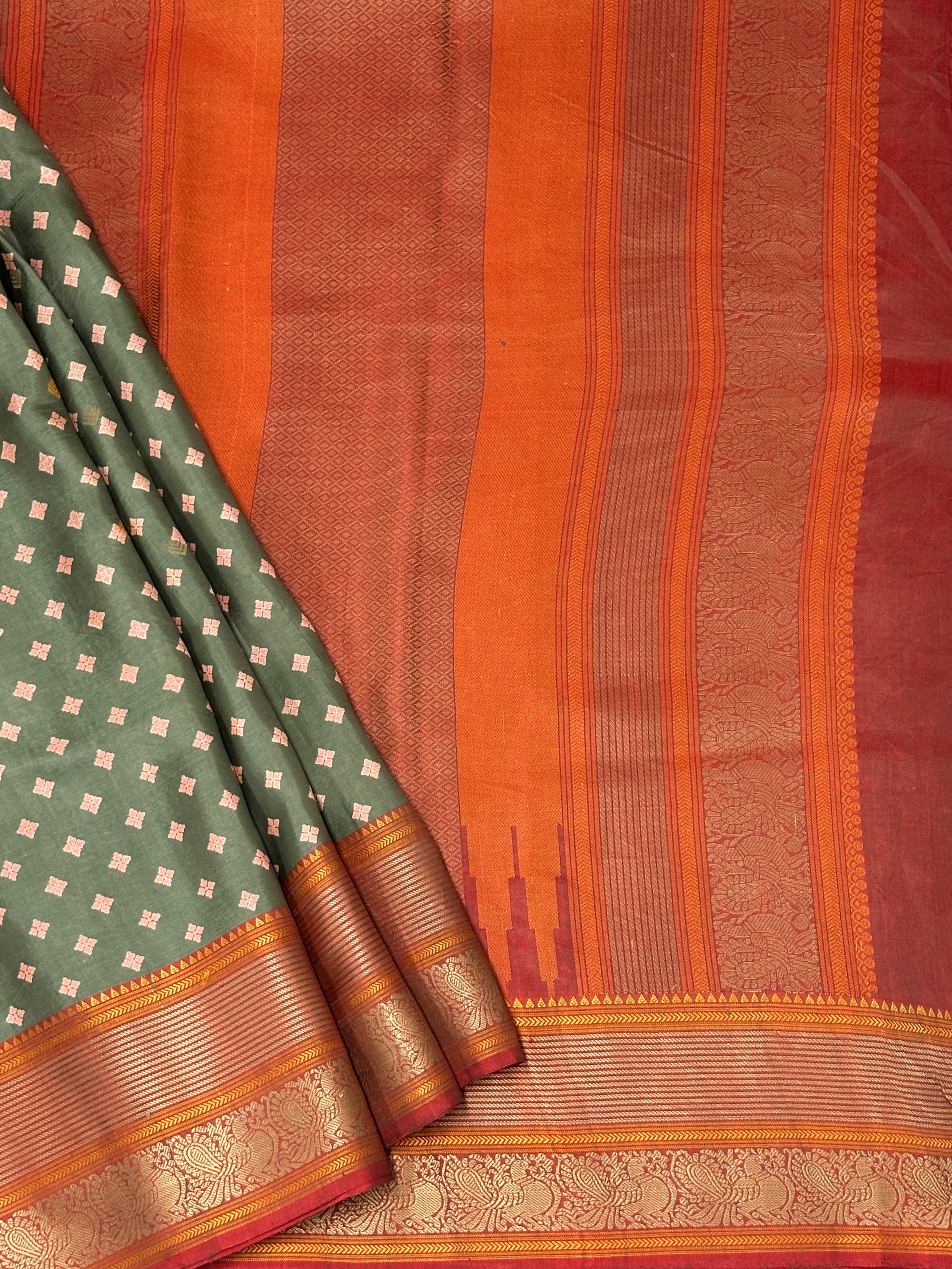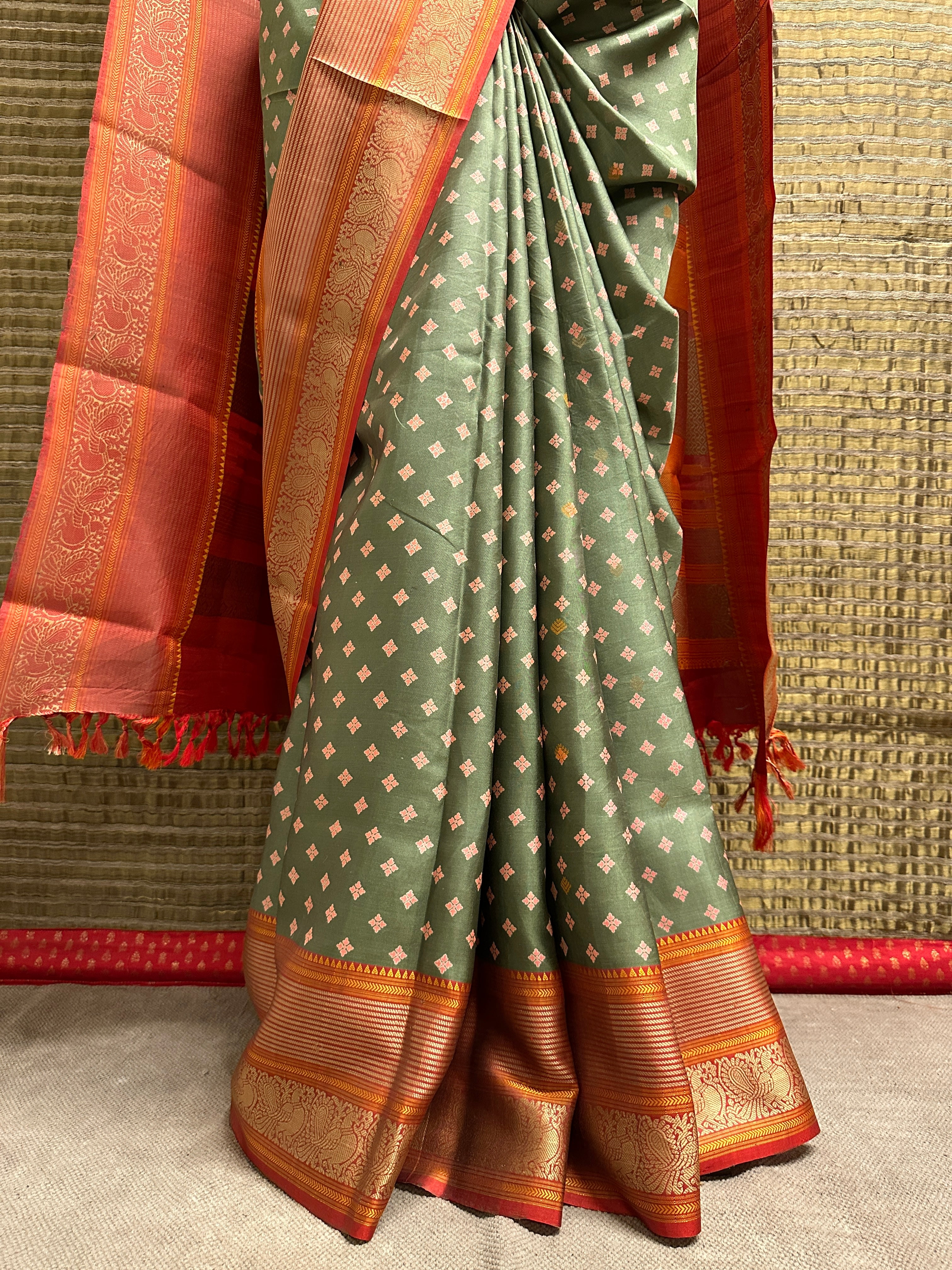 • Pallu intricately woven with traditional and elegant detailing in thread.