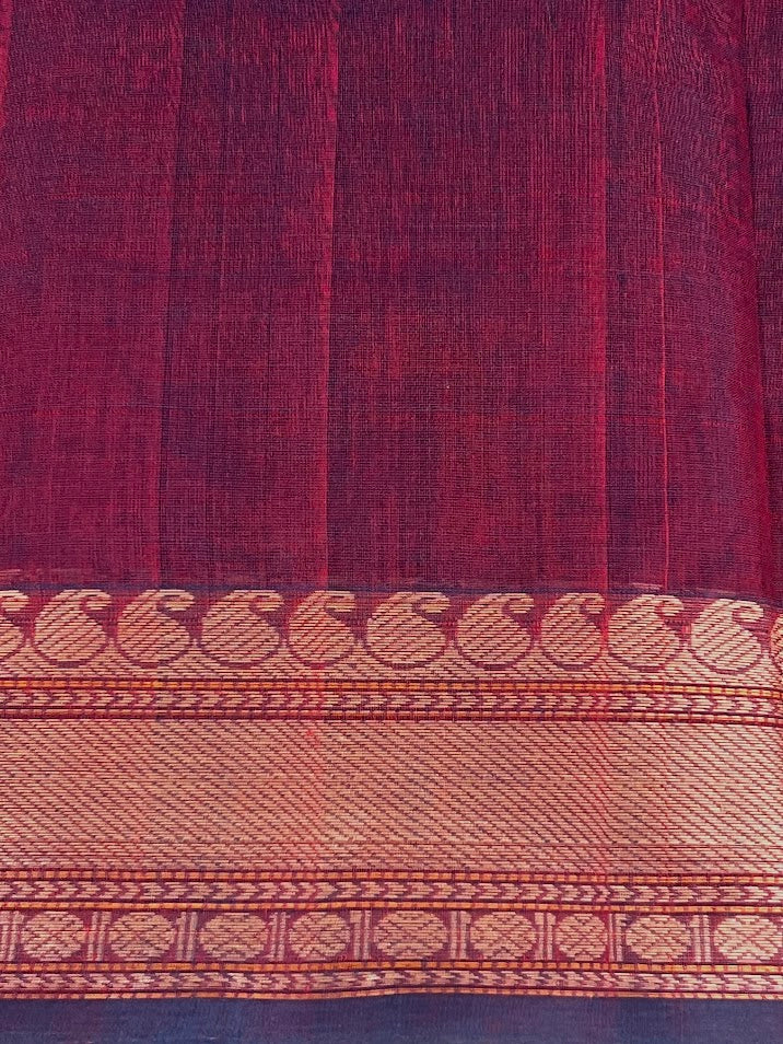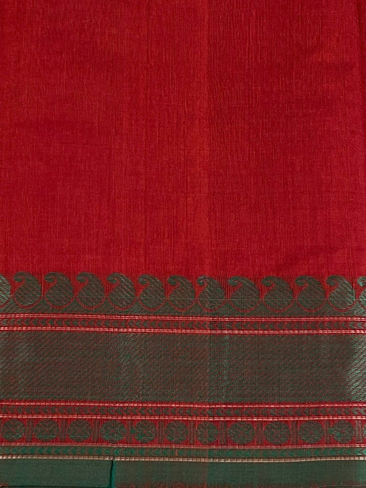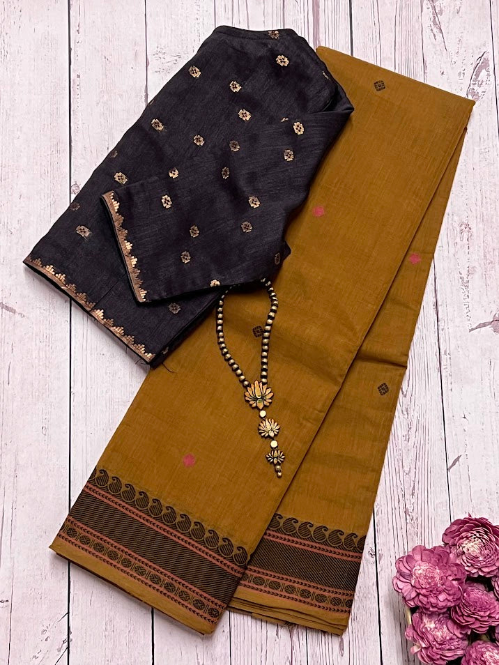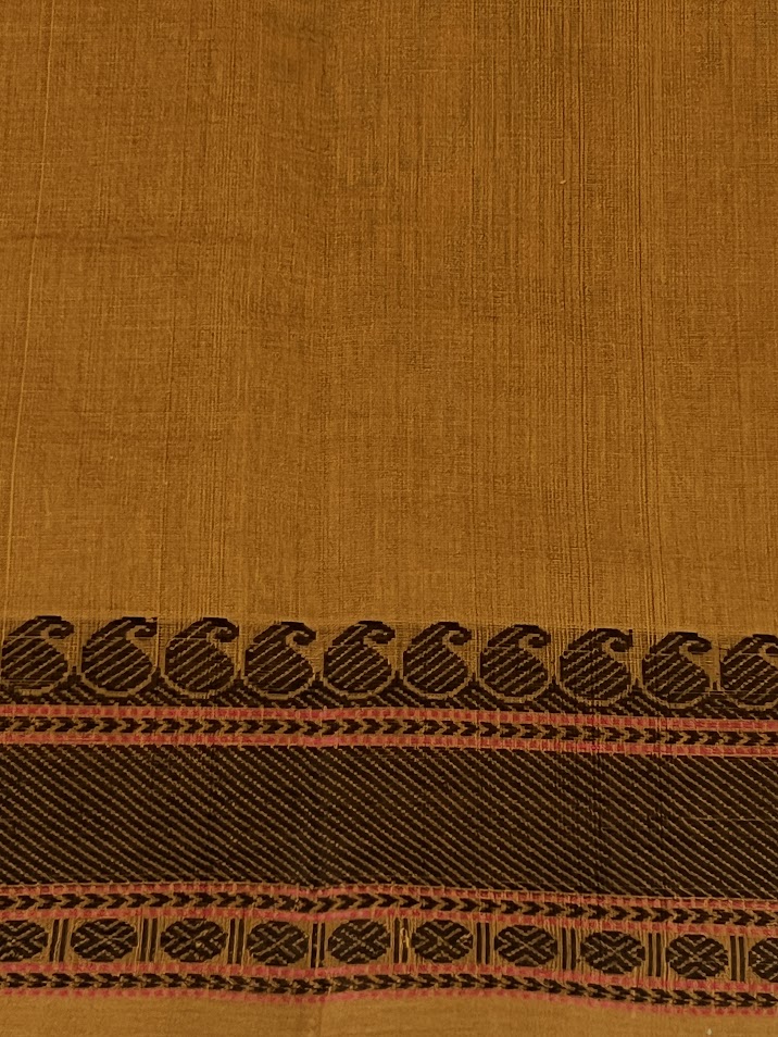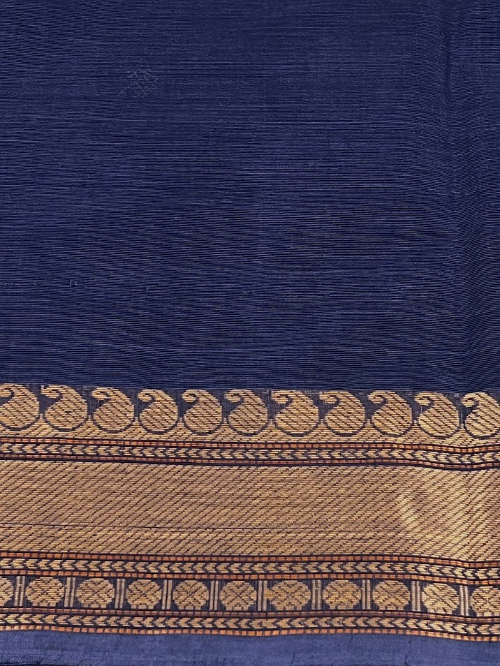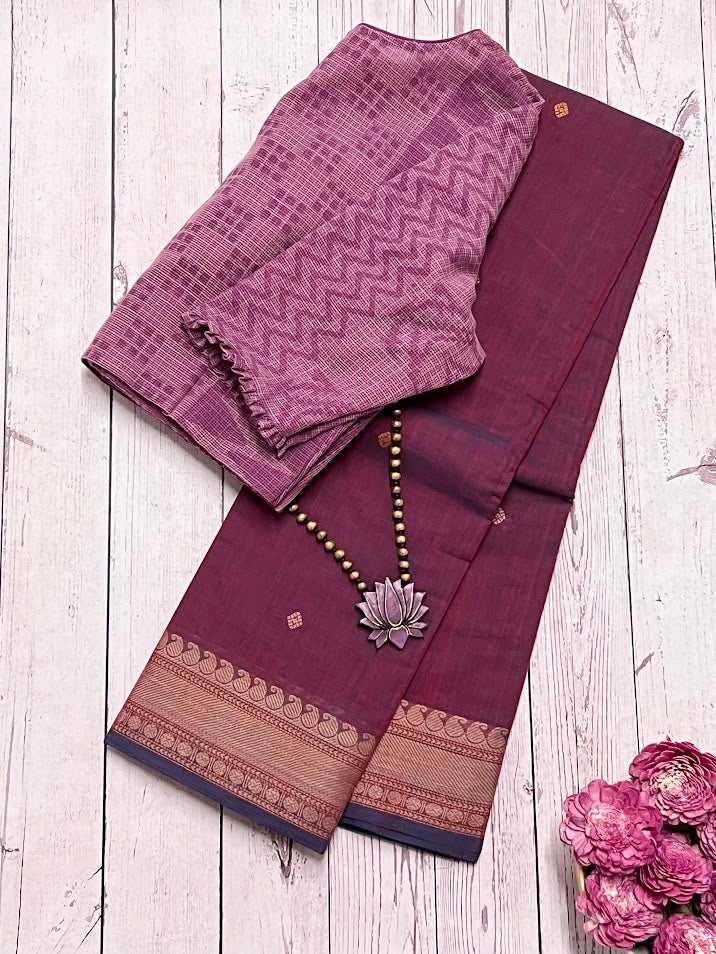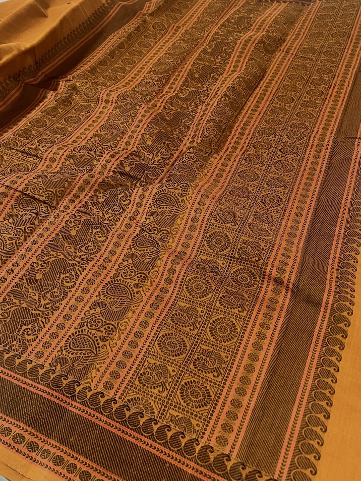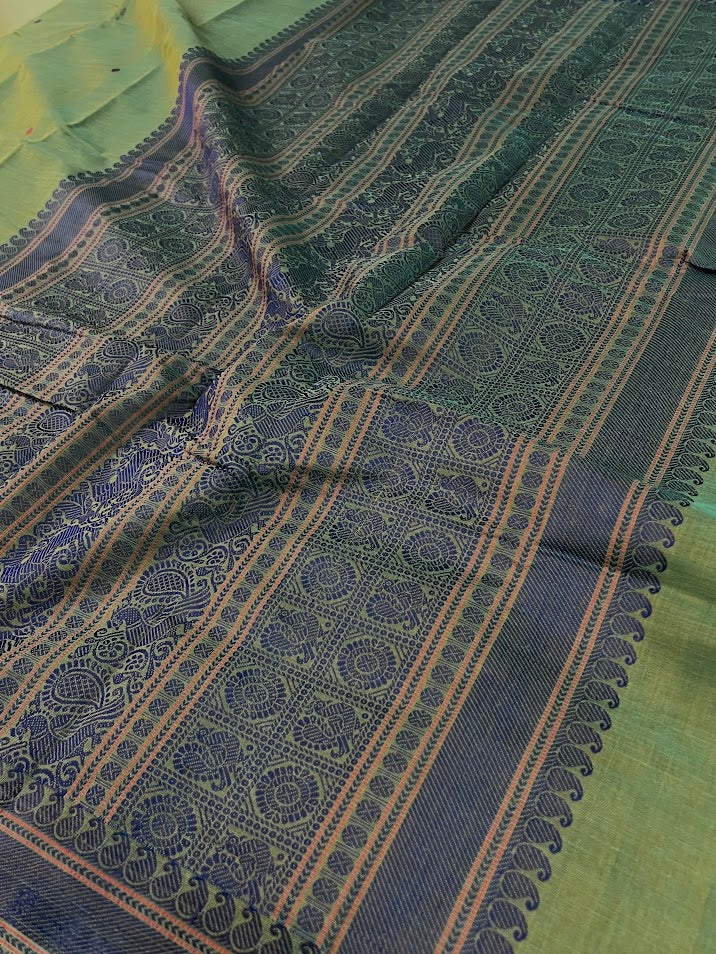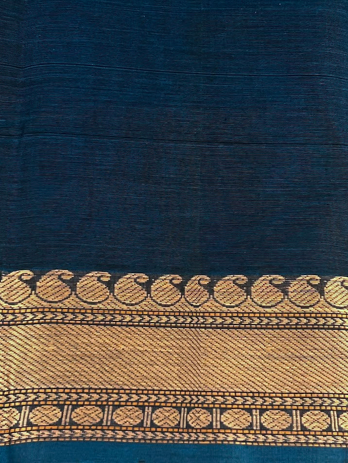 Woven with fine combed cotton yarns, it carries the breath of the artisan’s touch in every thread. Subtle motifs and borders reflect the region’s temple architecture and age-old symbolism—minimalist in style, but deeply rooted in soul.