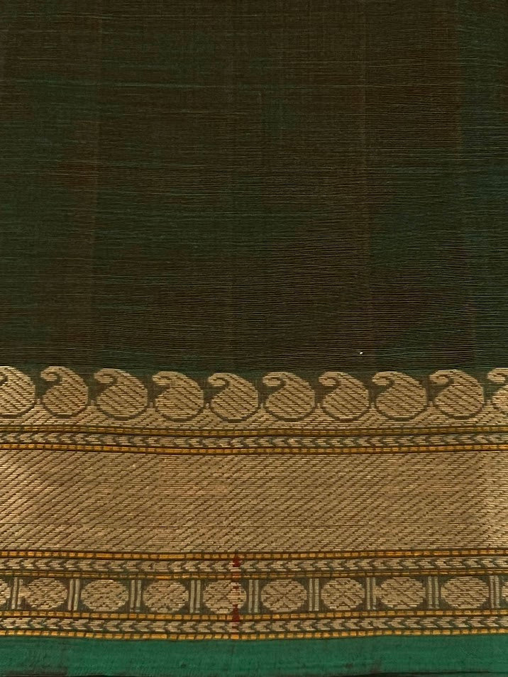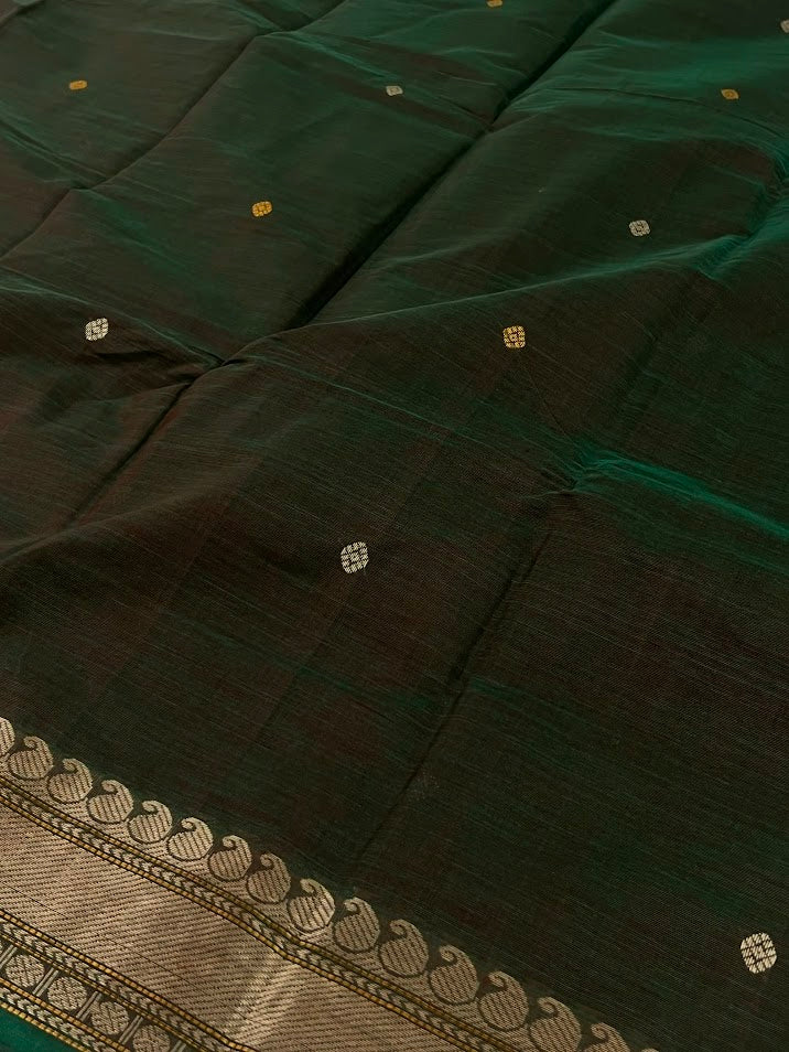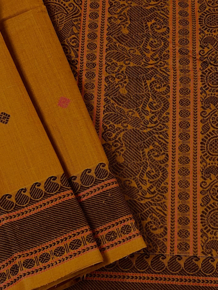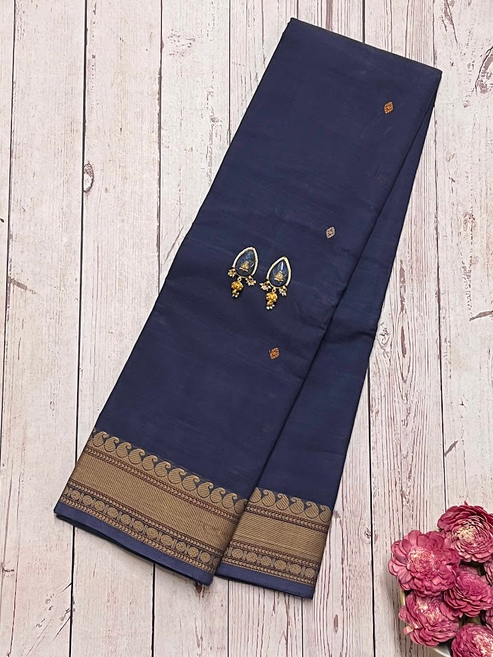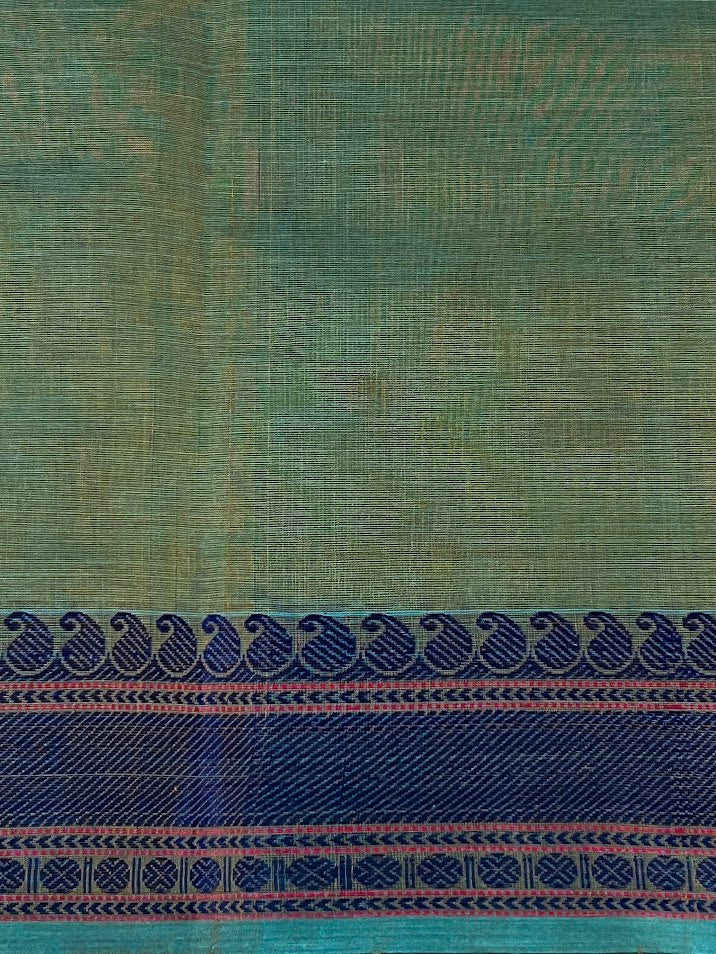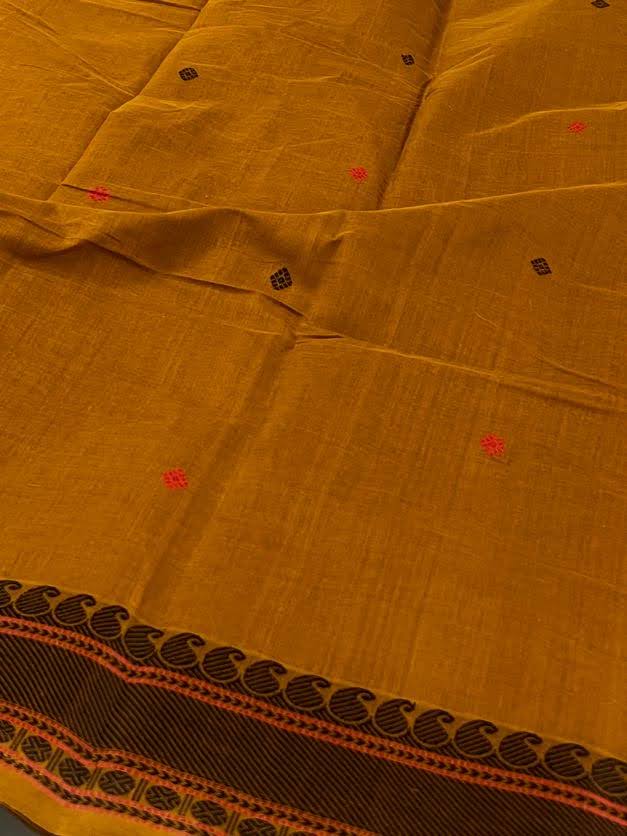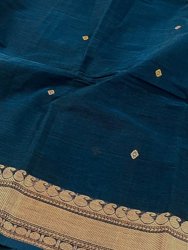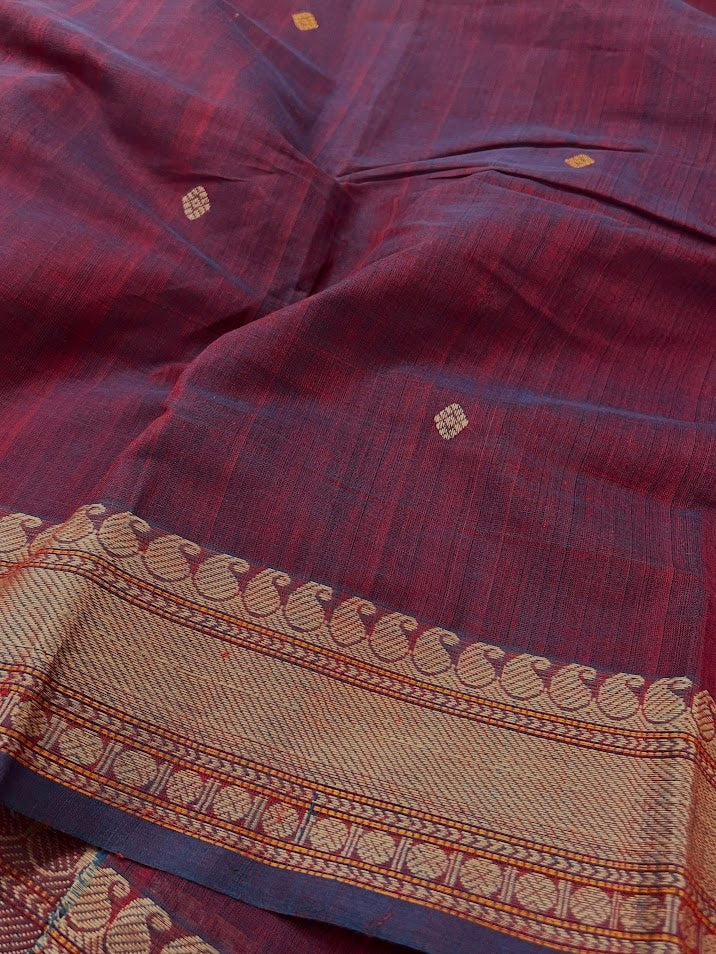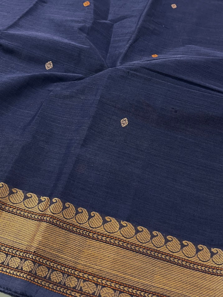 Woven with fine combed cotton yarns, it carries the breath of the artisan’s touch in every thread. Subtle motifs and borders reflect the region’s temple architecture and age-old symbolism—minimalist in style, but deeply rooted in soul.