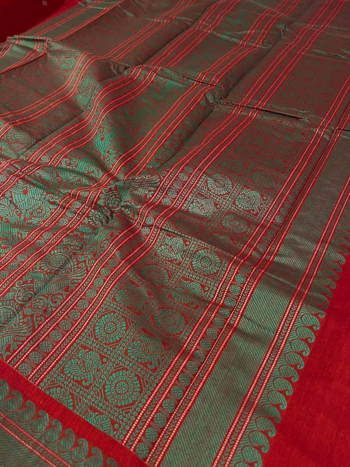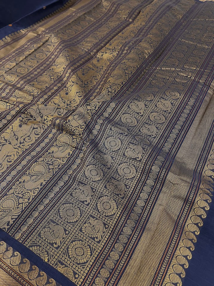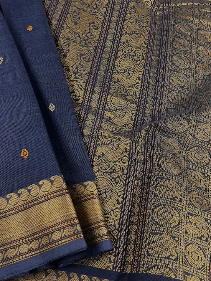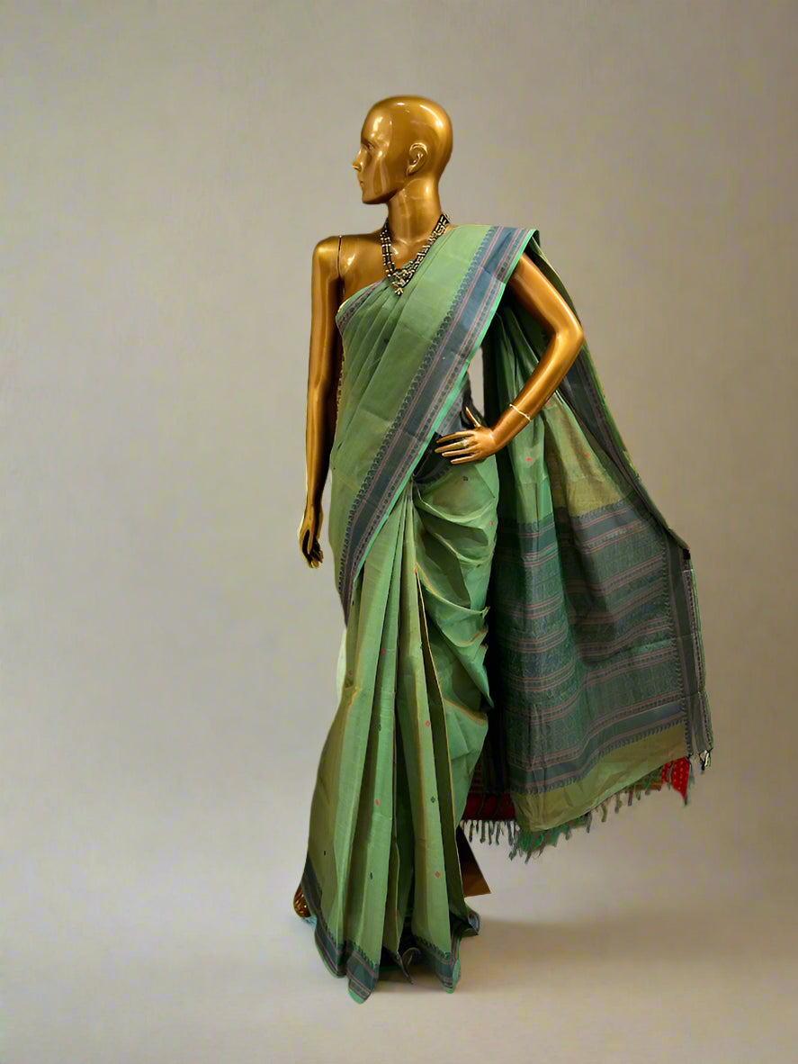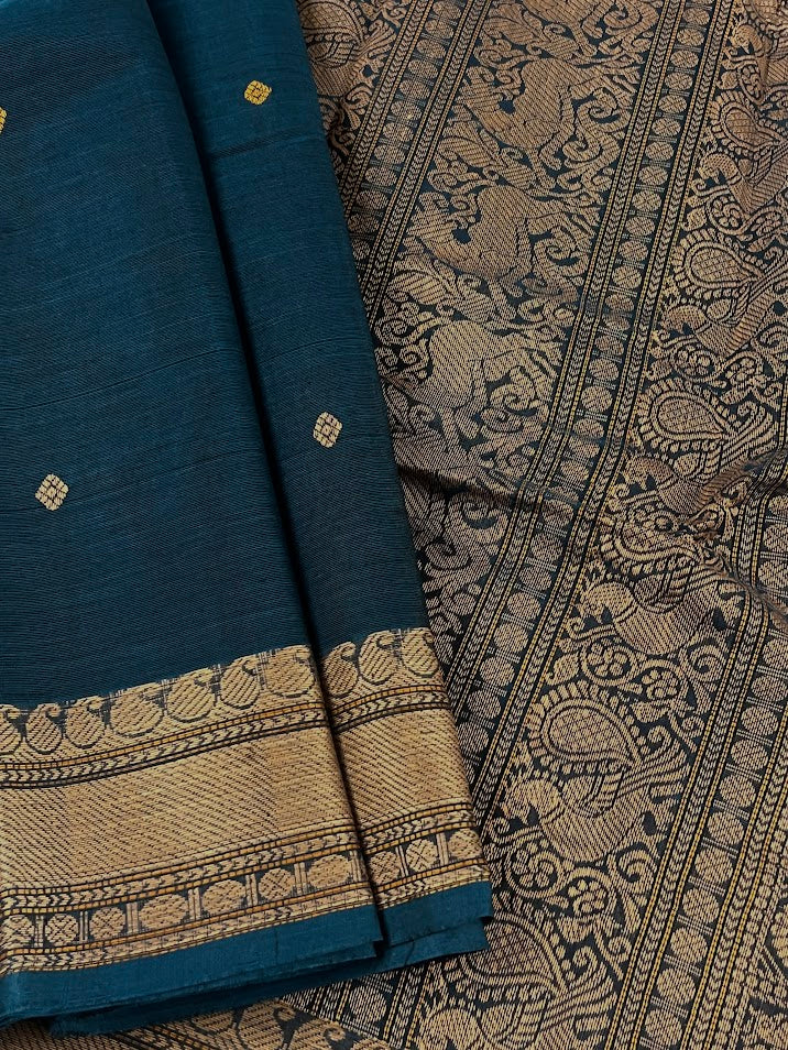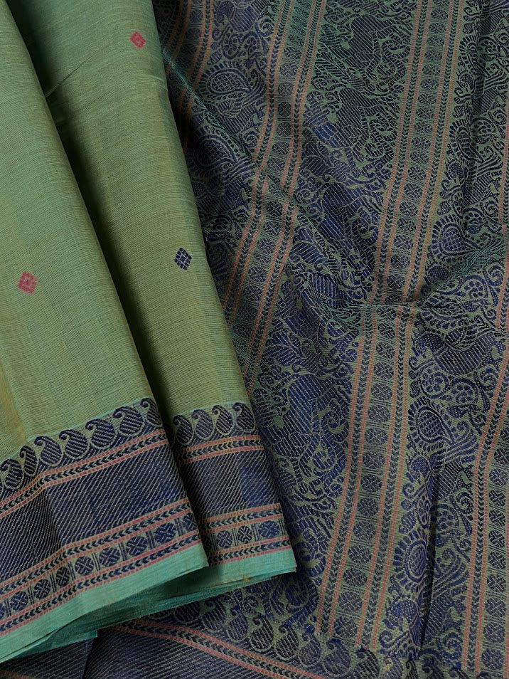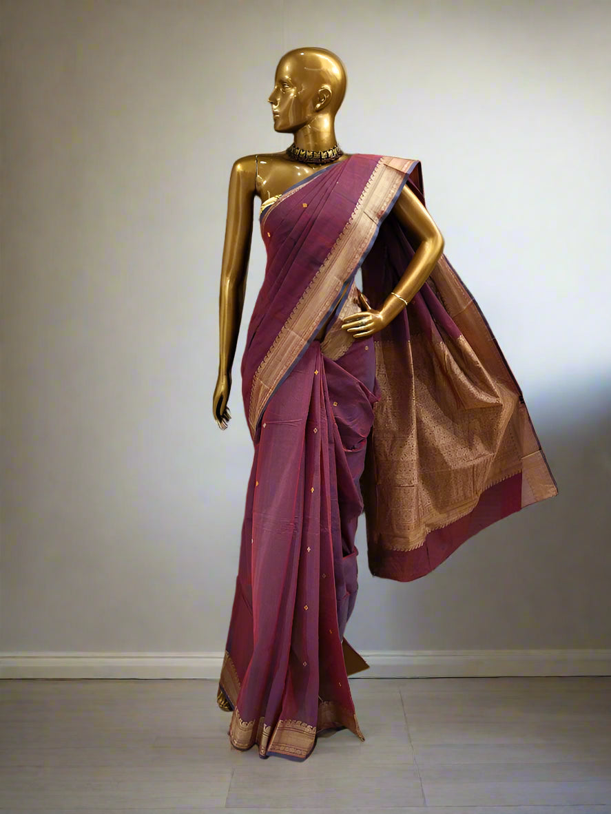 Woven with fine combed cotton yarns, it carries the breath of the artisan’s touch in every thread. Subtle motifs and borders reflect the region’s temple architecture and age-old symbolism—minimalist in style, but deeply rooted in soul.
