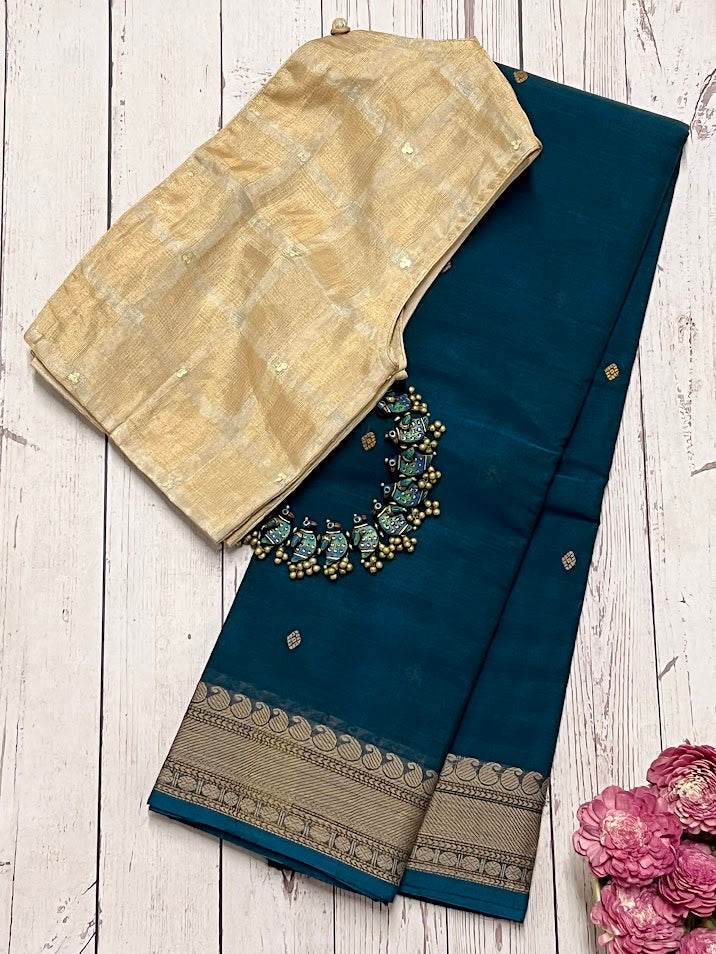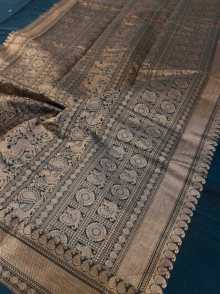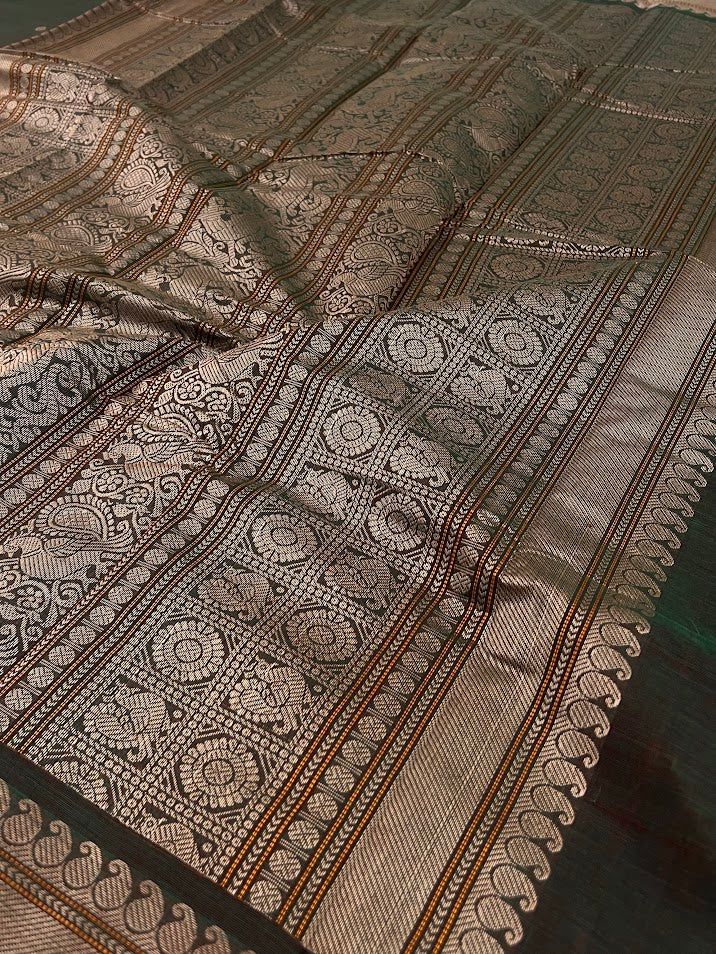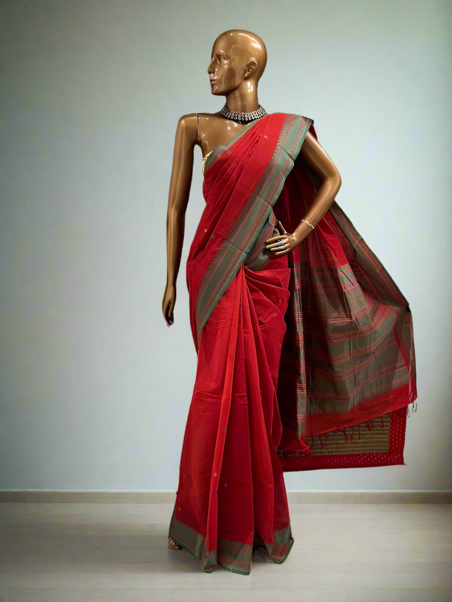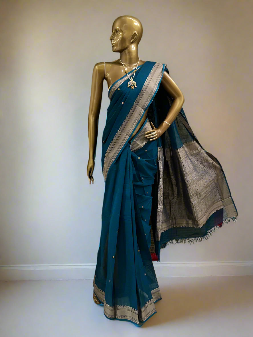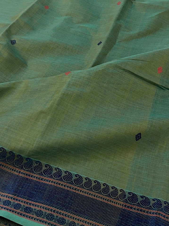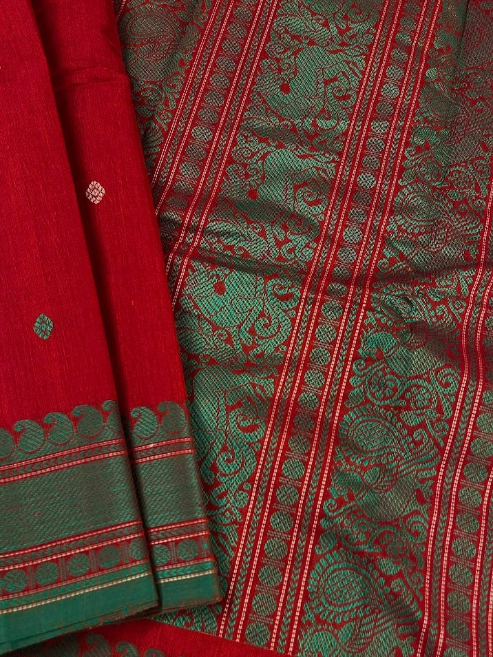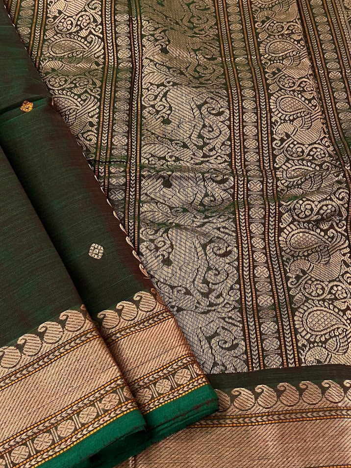 Woven with fine combed cotton yarns, it carries the breath of the artisan’s touch in every thread. Subtle motifs and borders reflect the region’s temple architecture and age-old symbolism—minimalist in style, but deeply rooted in soul.