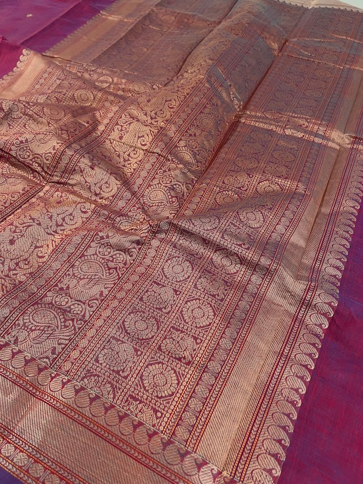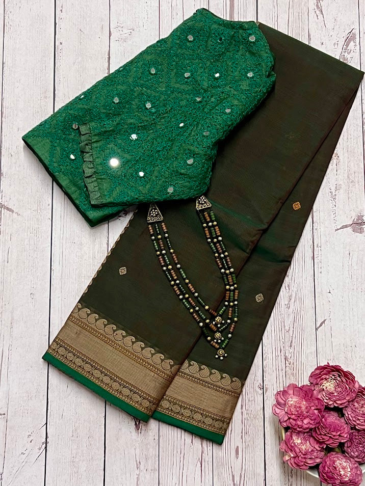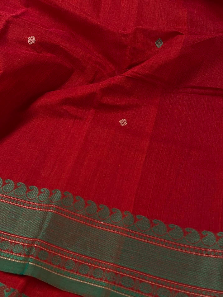 Wrap yourself in heritage with this handwoven Kanchi cotton sari—an ode to timeless craftsmanship from the looms of Tamil Nadu. Lightweight yet structured, this sari drapes with grace, making it a perfect companion for long workdays, cultural gatherings, or quiet evenings of reflection.