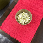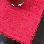 Red linen table runner with hand crafted lace edging.Wash care : Gentle hand wash / Dry clean onlyLength : 72 "Width : 16"
