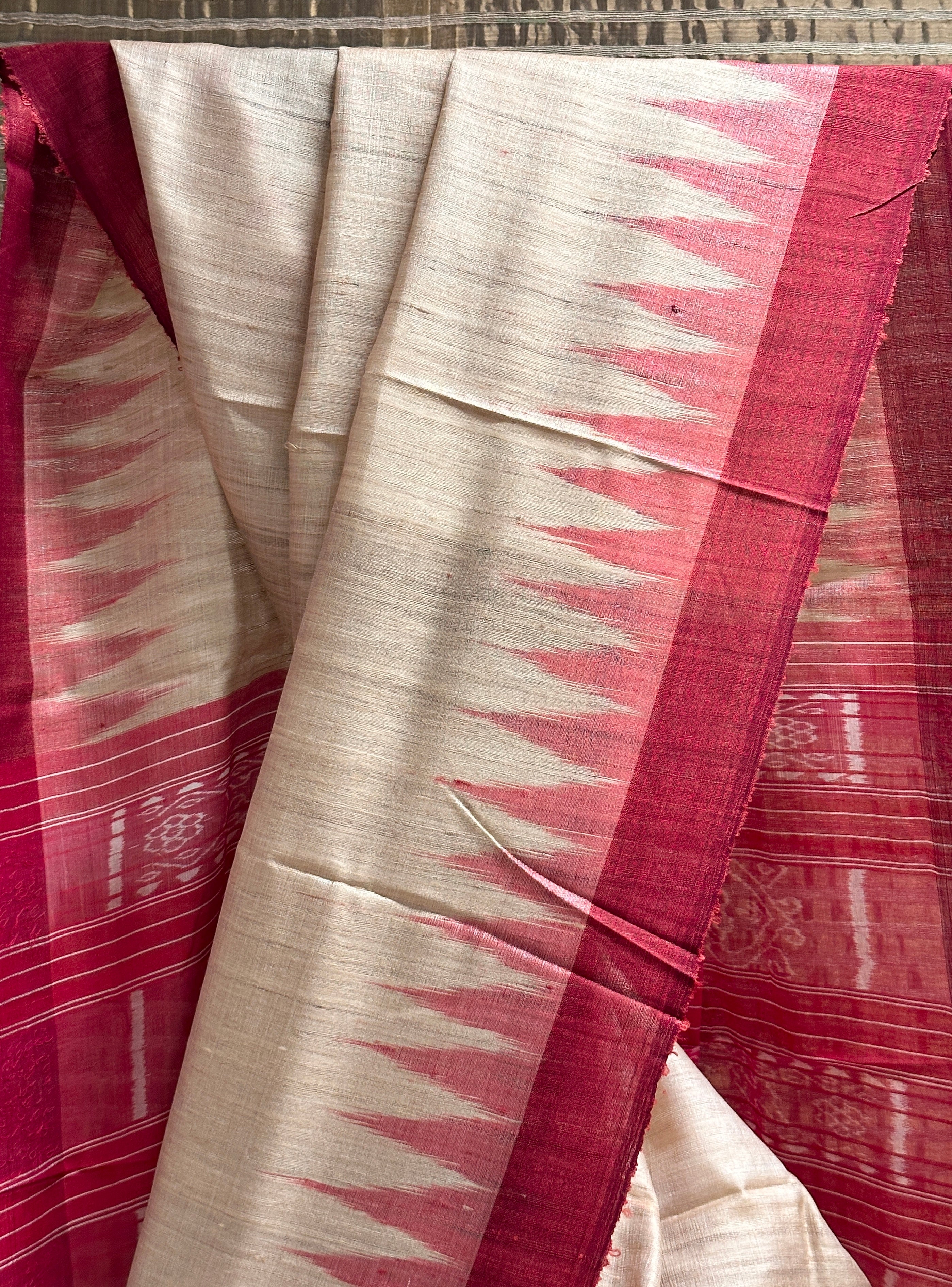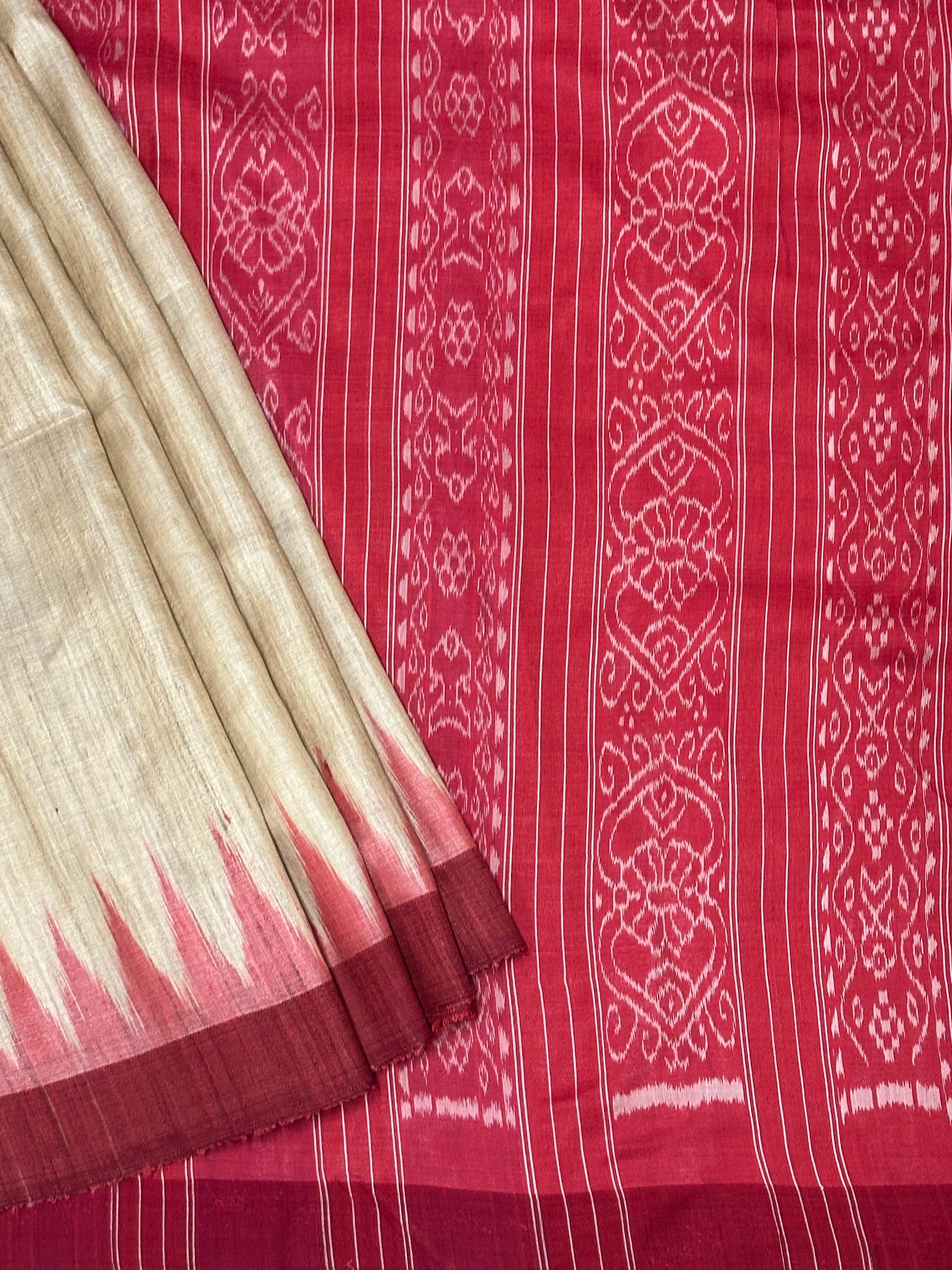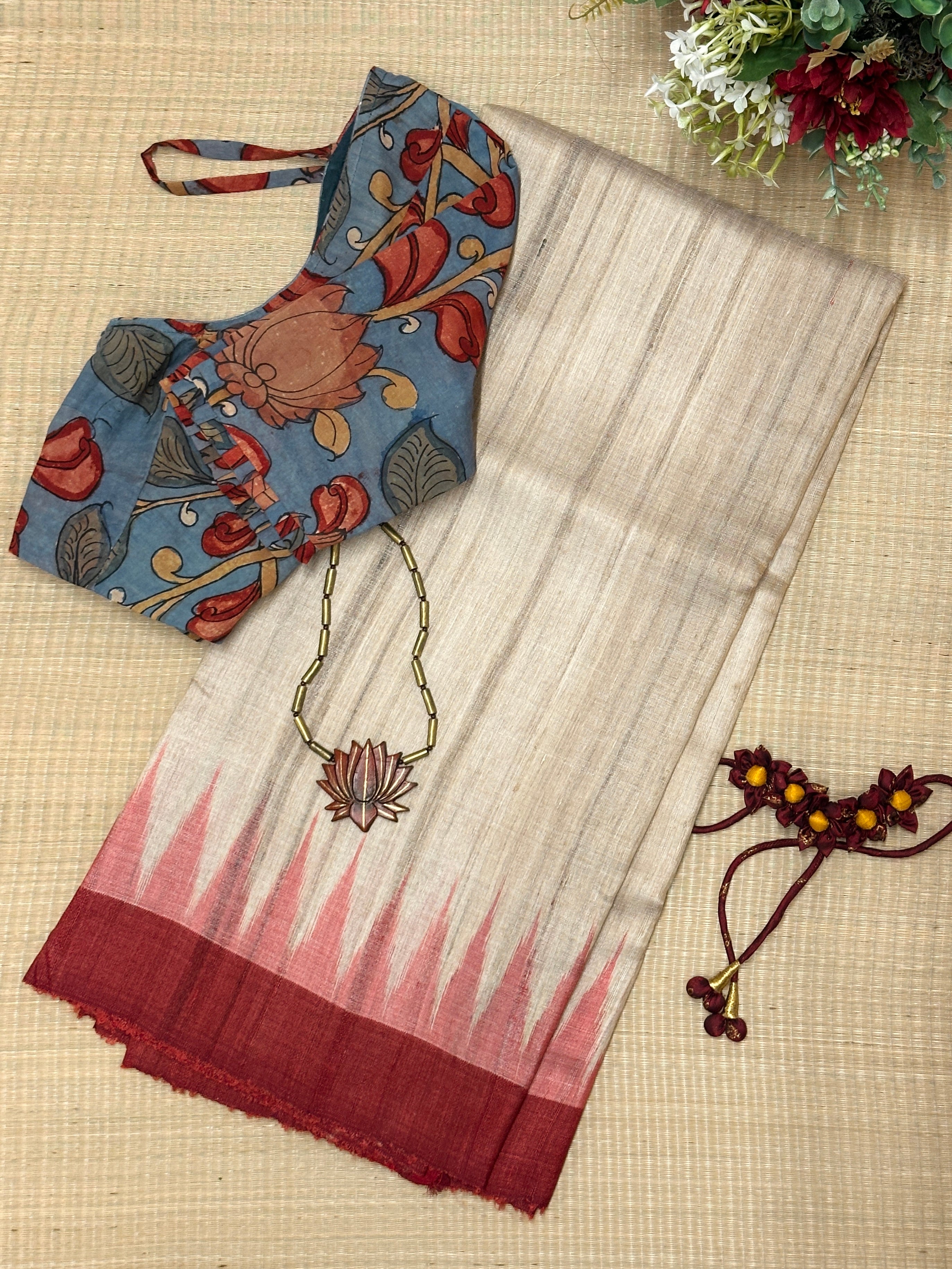 • Tussar silk saree with a plain beige body for an elegant, minimal look.