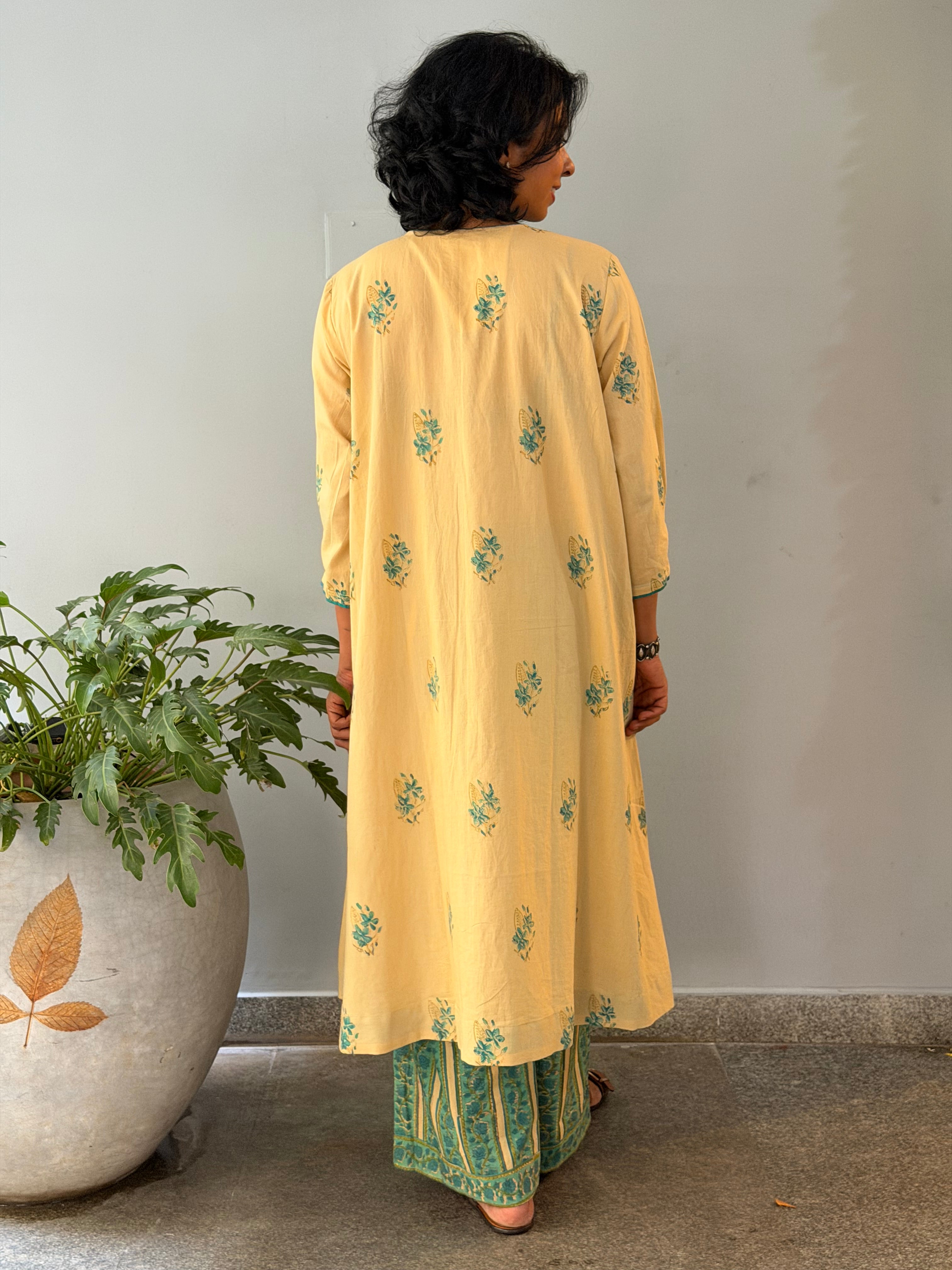 • Paired with turquoise printed wide-leg cotton pants designed for comfort.