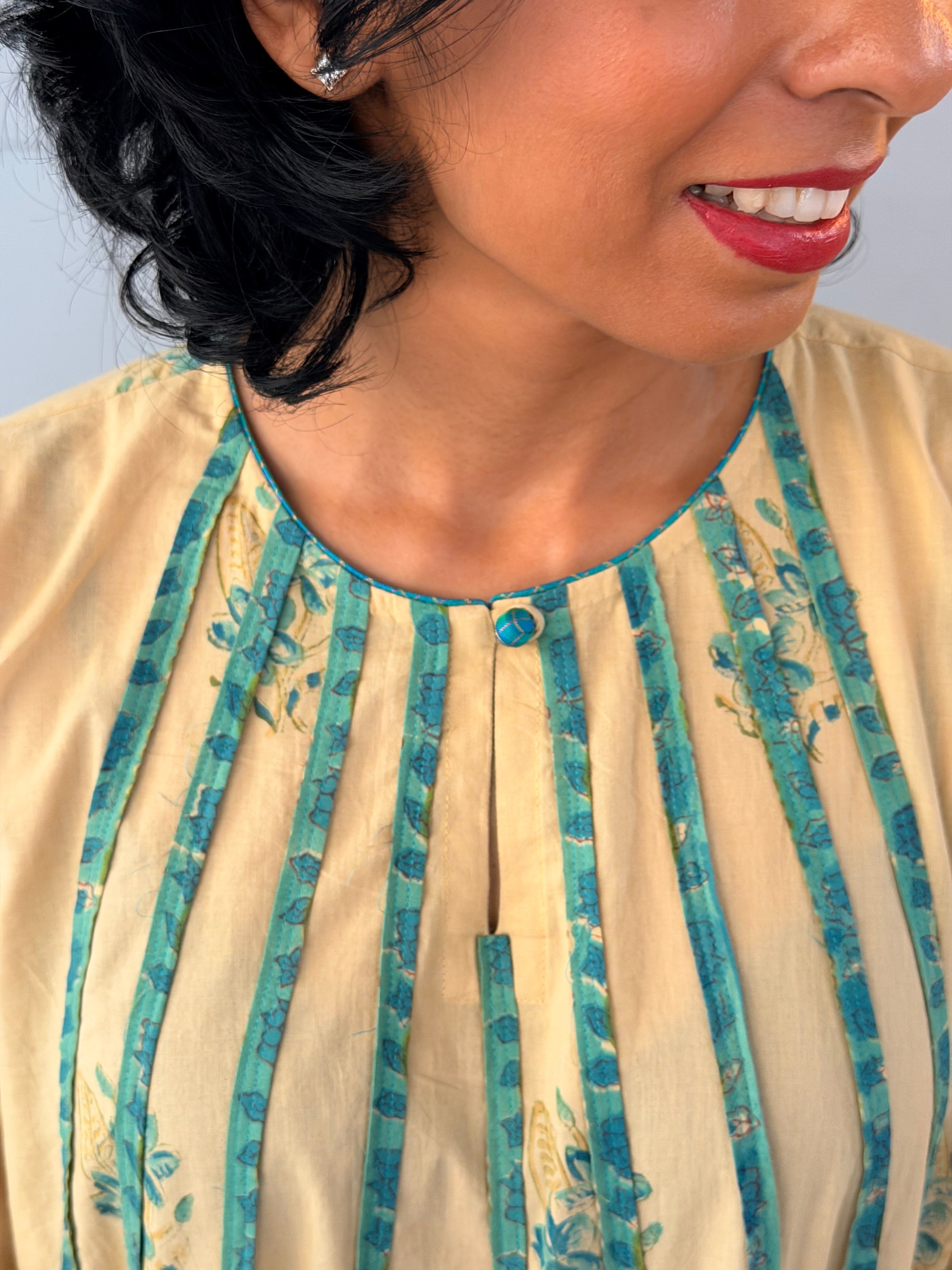 • 3/4 sleeves with pleated hems, finished with gathered edging using our signature Kanchi silk.