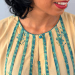 • Features turquoise striped and printed panels arranged in a kali-style pattern from neckline to hem.
