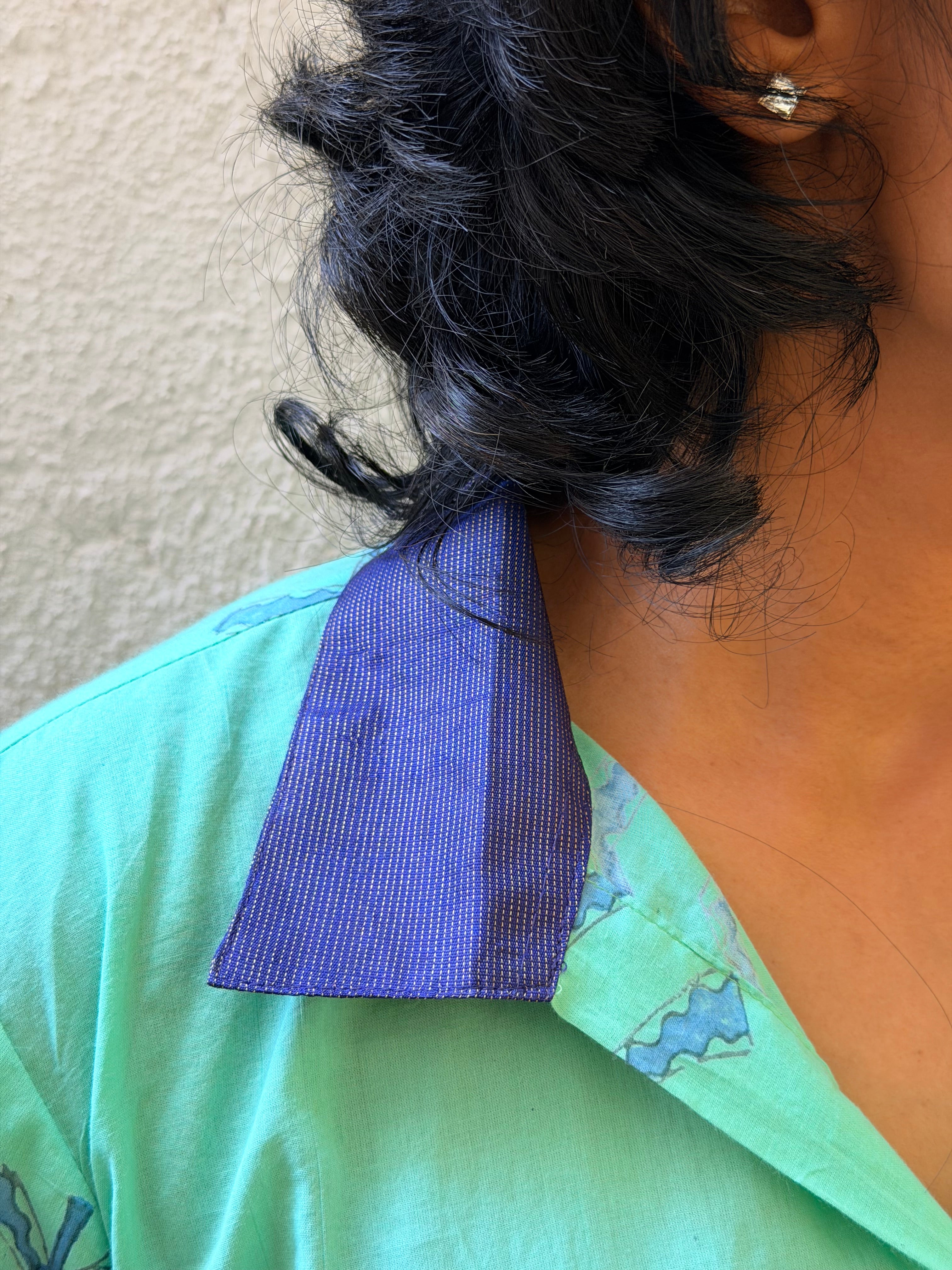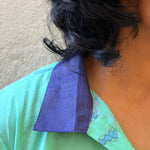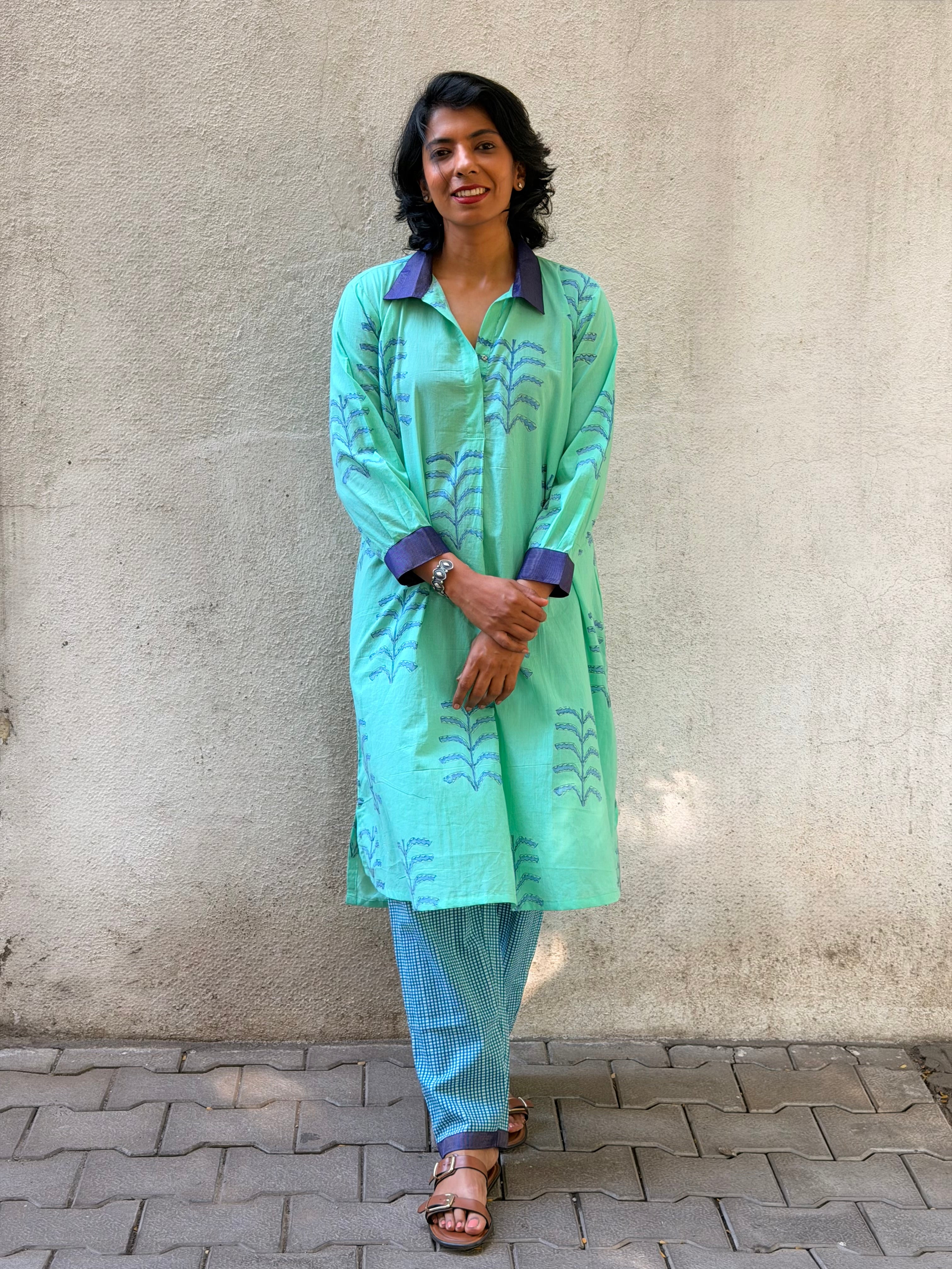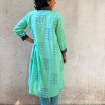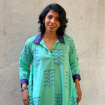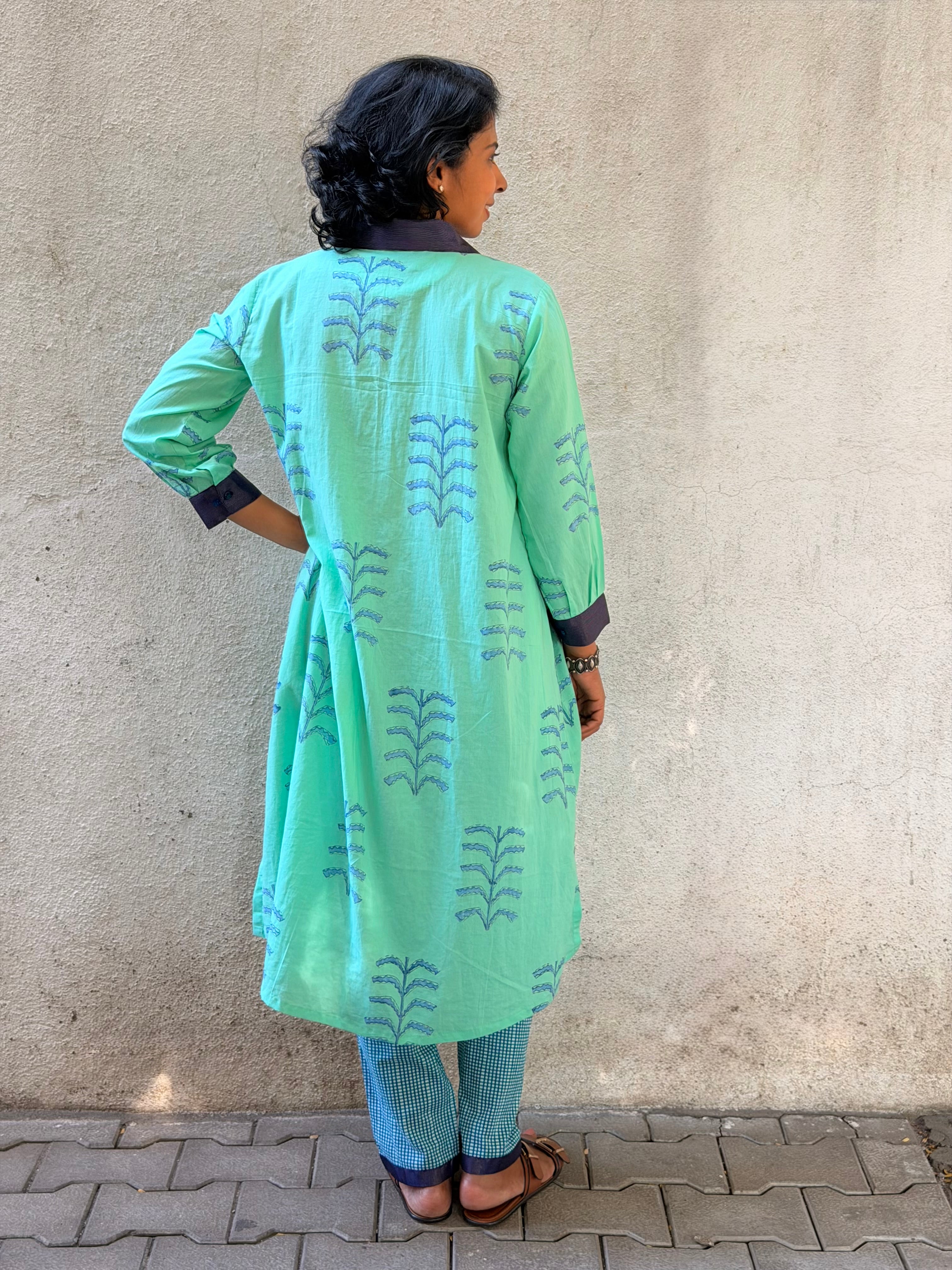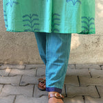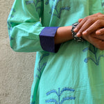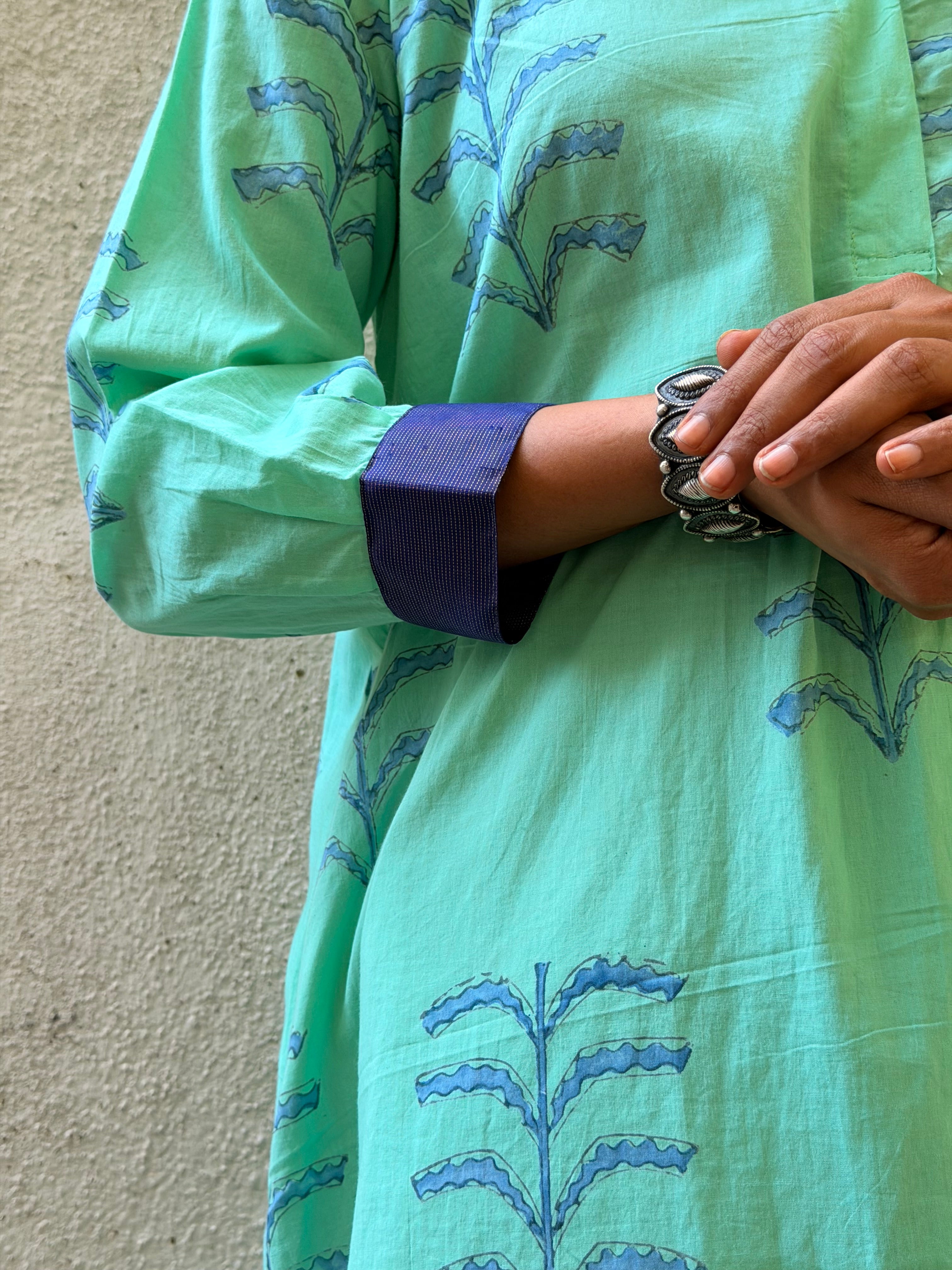 • Crafted in handloom cotton, hand block printed using azo-free dyes, featuring large turquoise floral motifs and finished with our signature Kanchipuram silk detailing on the collar.