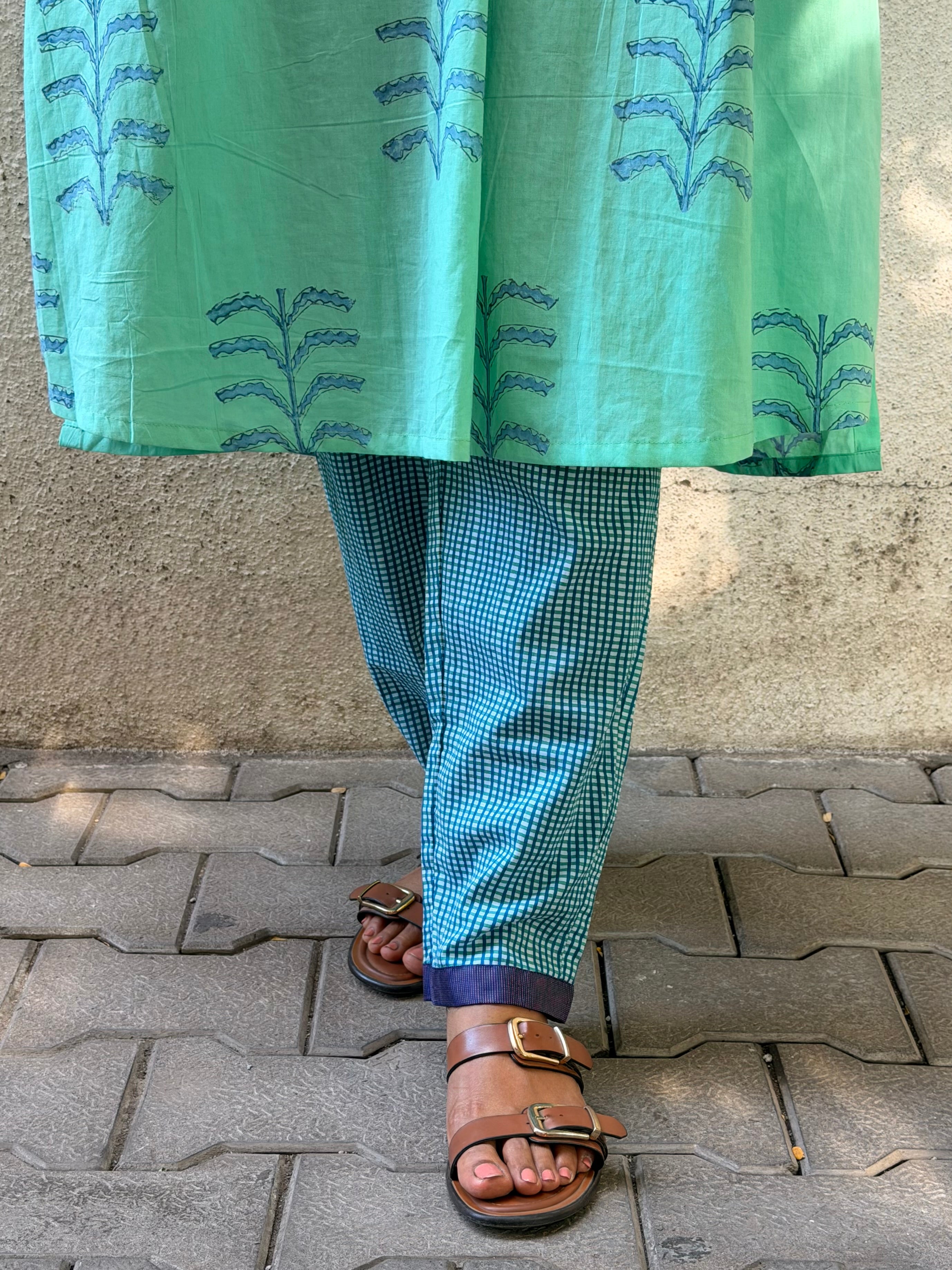 • Paired with blue and white check straight pants with Kanchipuram silk detailing on the hem.